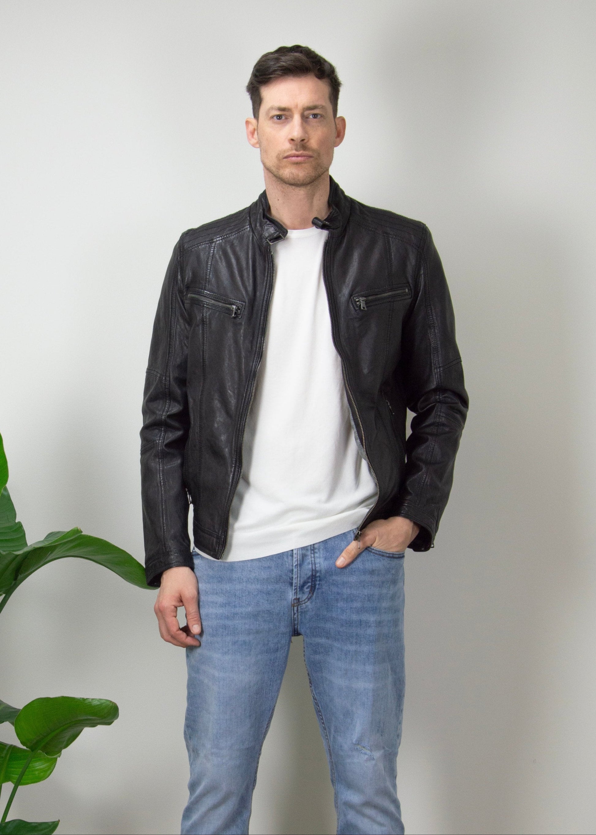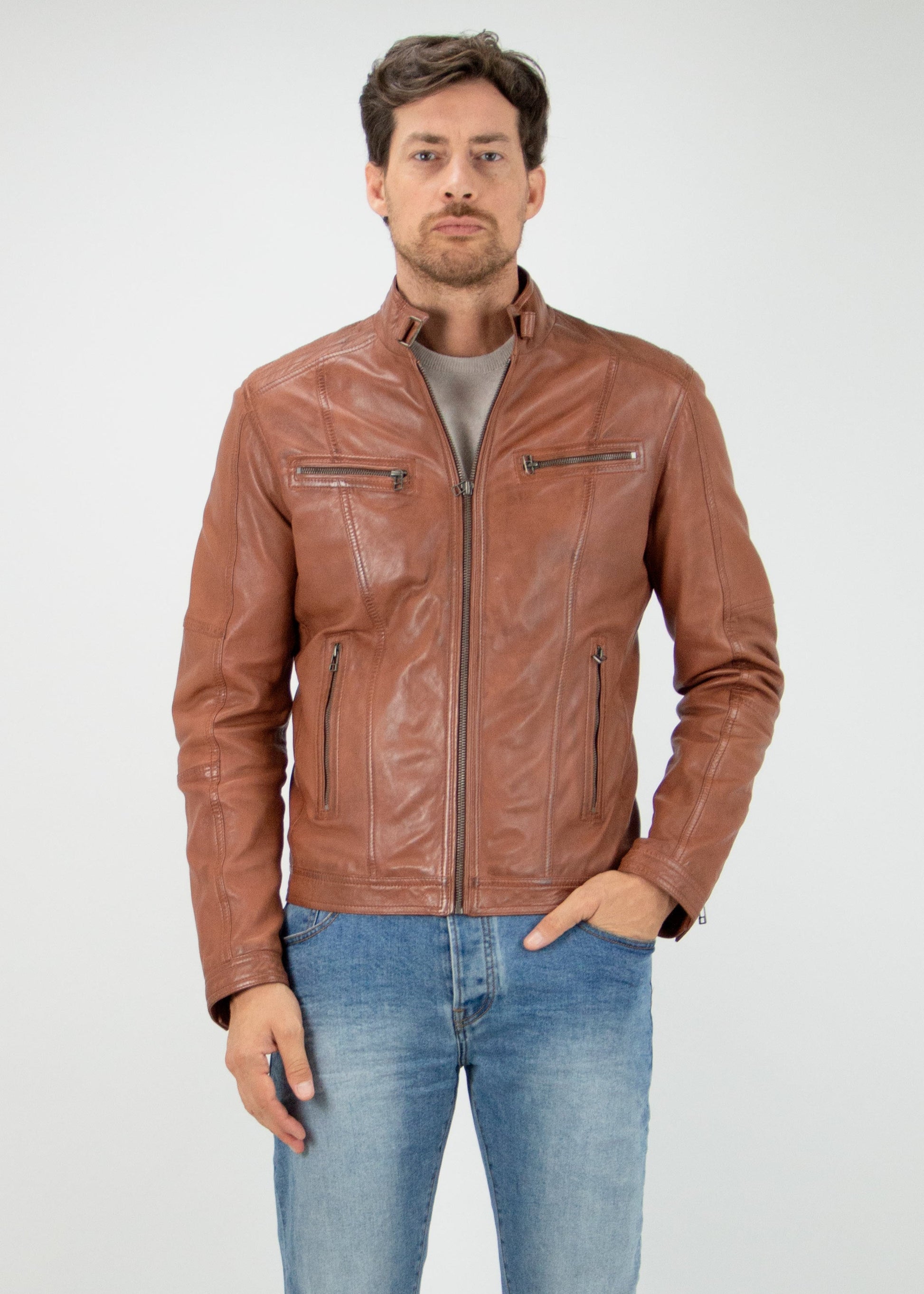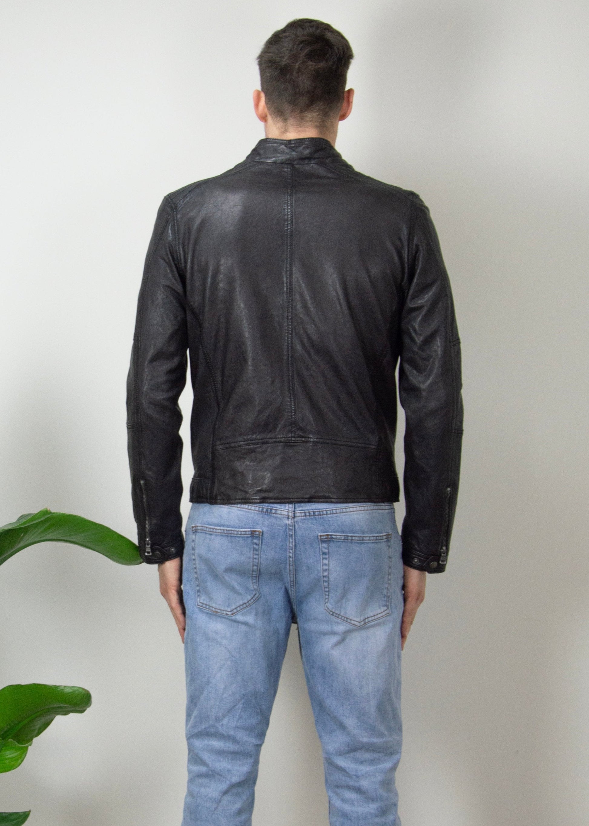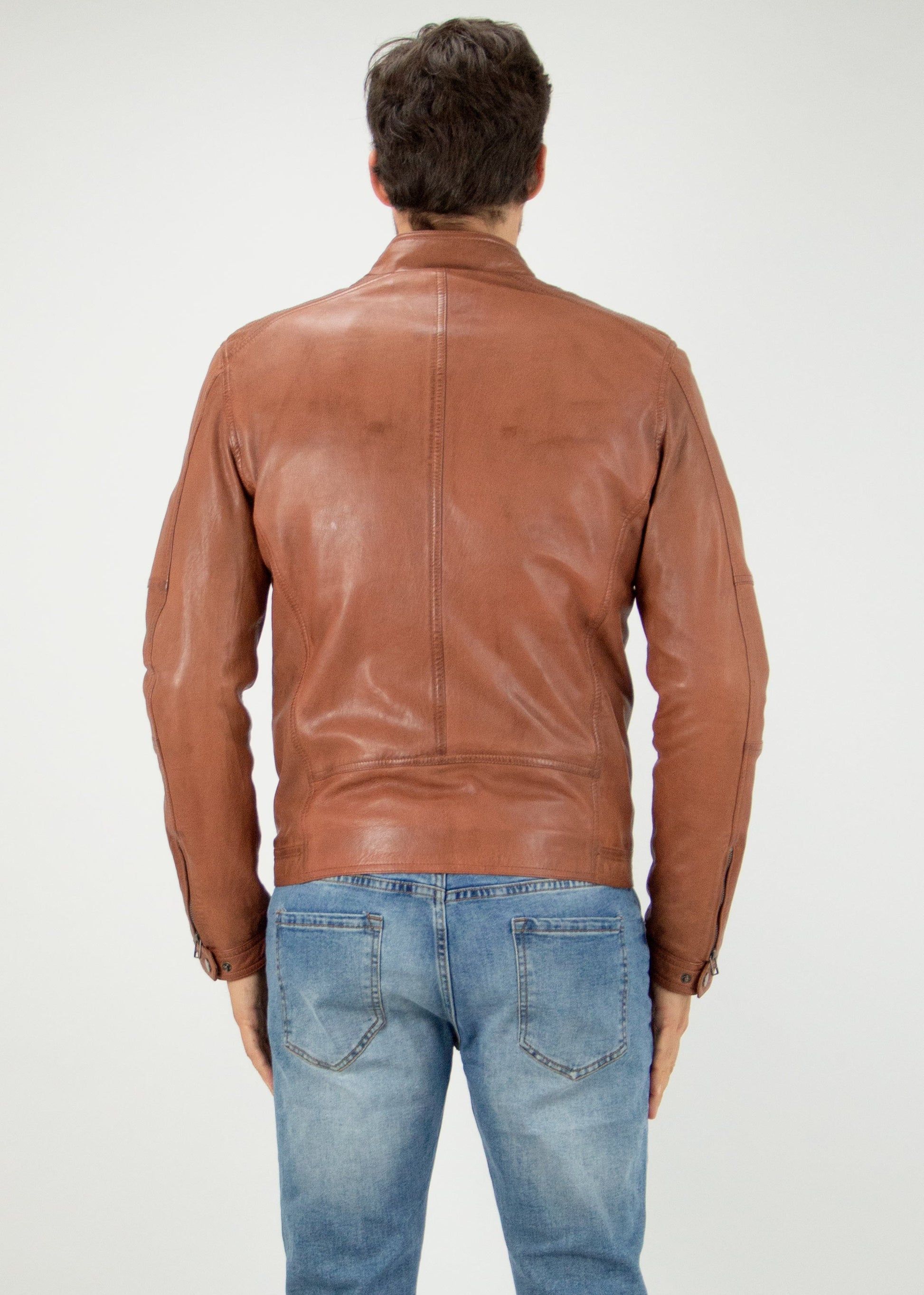 Giubbino biker in nappa stone washed tamponata a manocolletto alla coreana con cinturino.