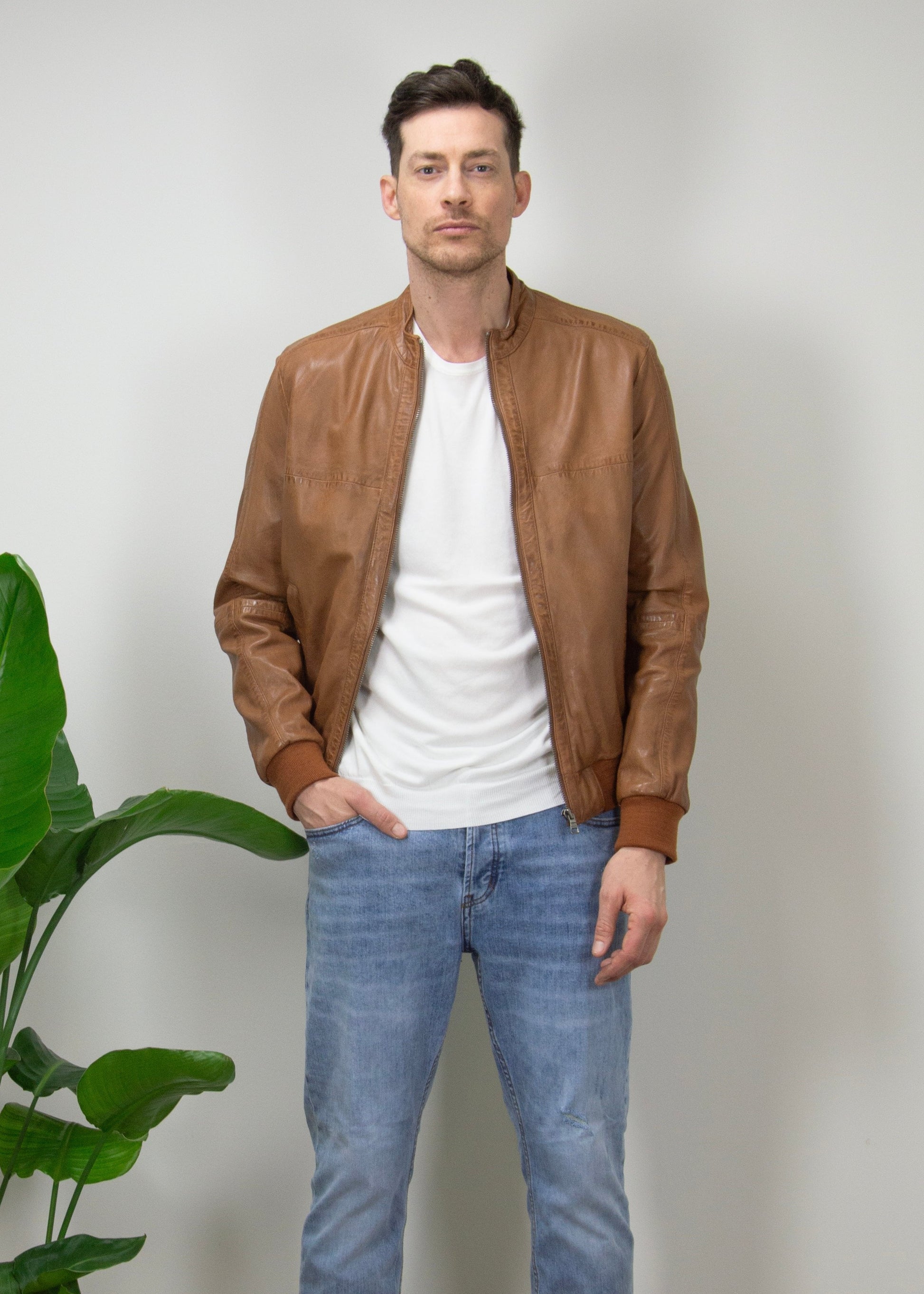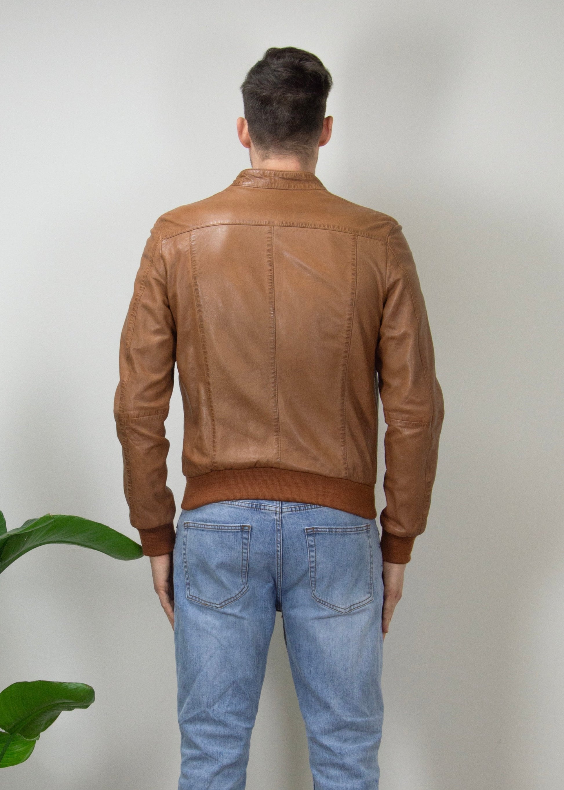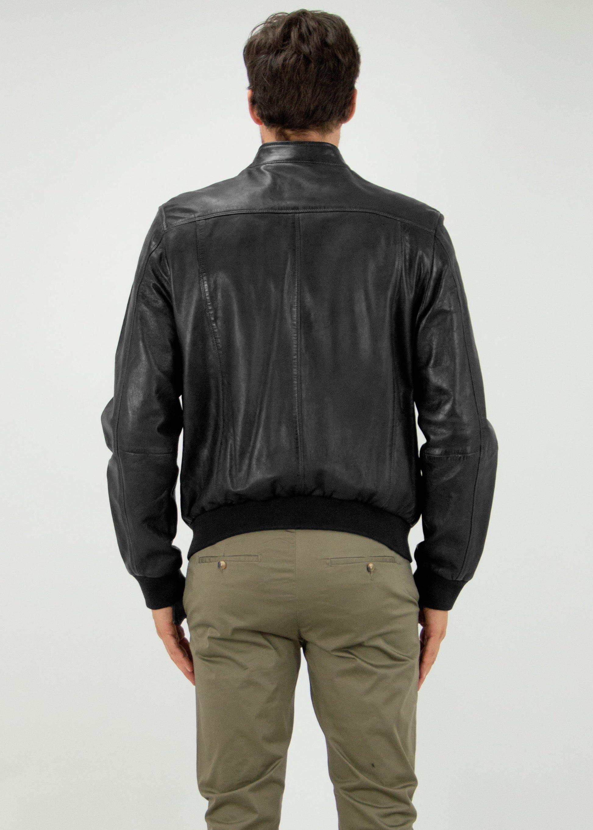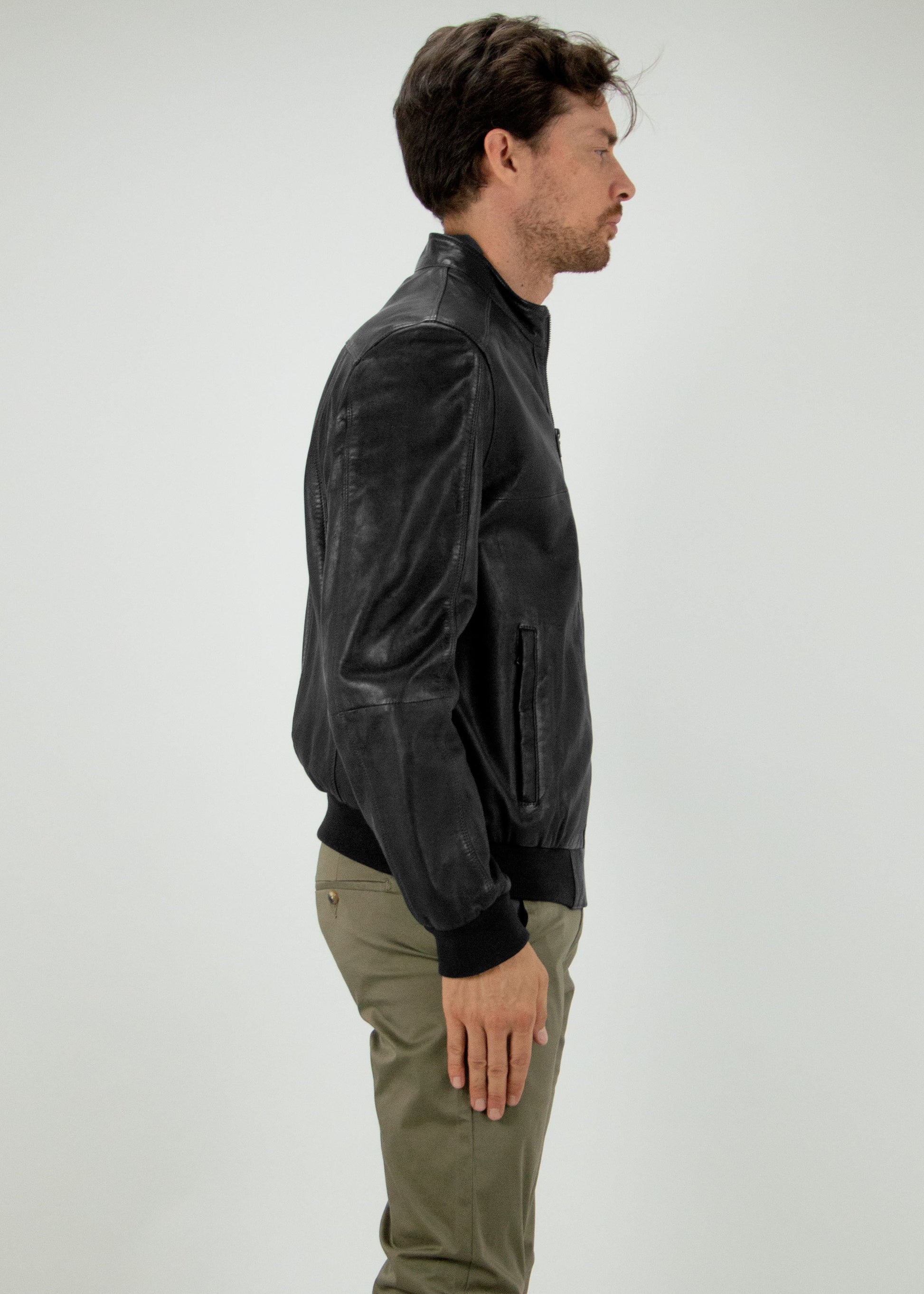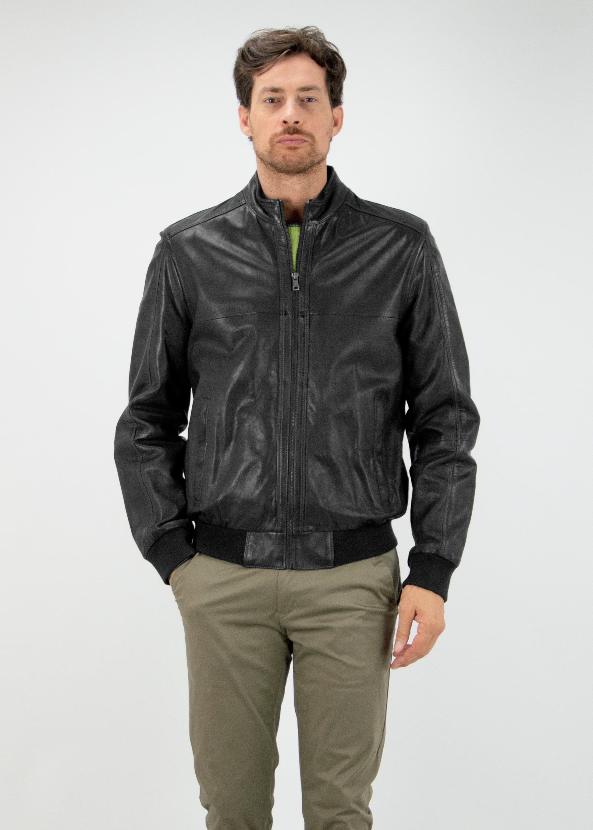 Giubbino bomber in vera pelle con colletto alla coreana. Tamponature nelle cuciture per donare un effetto vissuto.