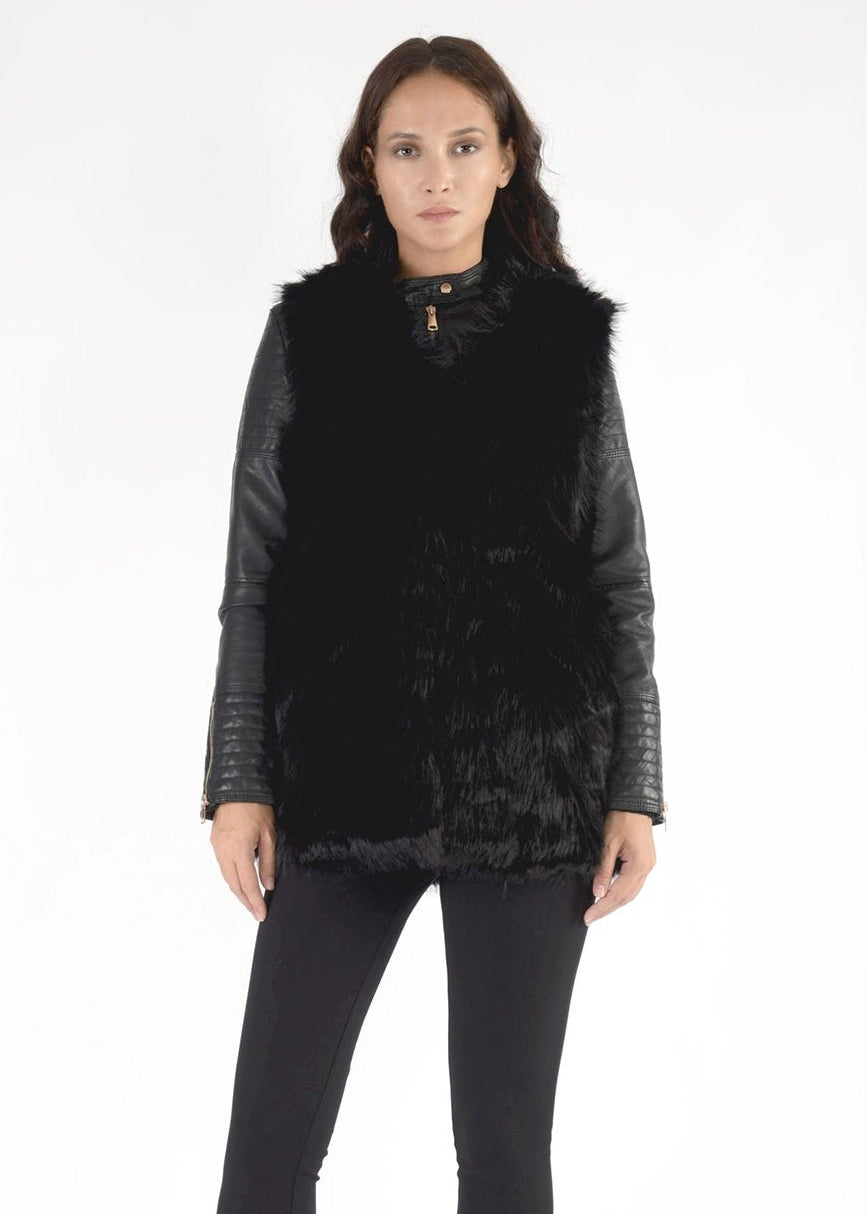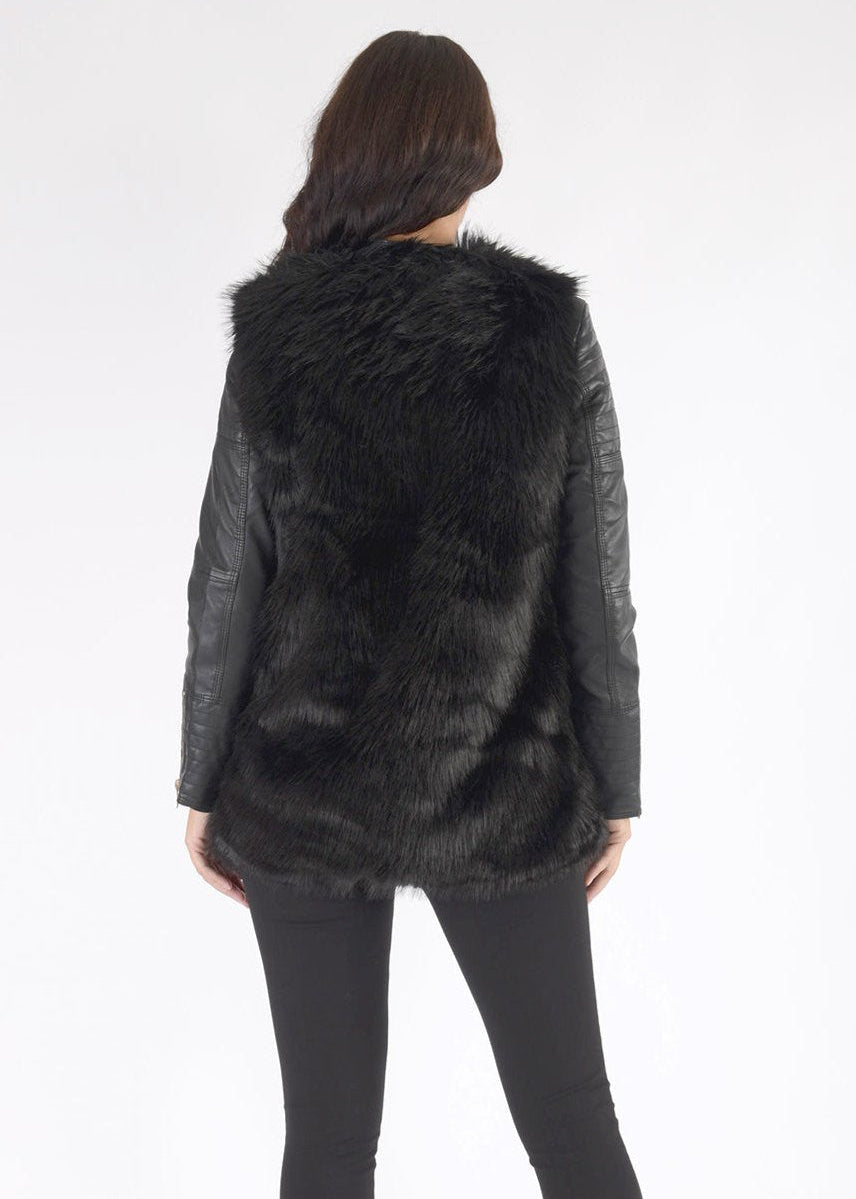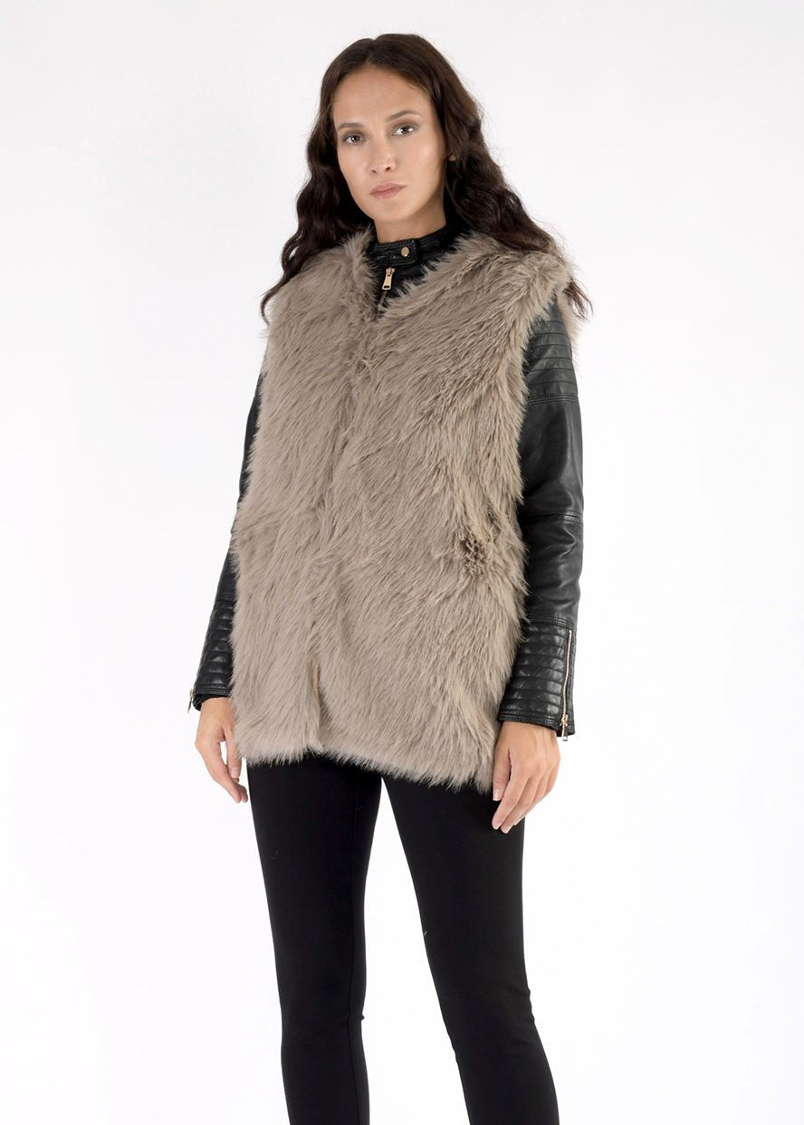 Giaccone smanicato da donna in ecopelliccia con ganci di chiusura.