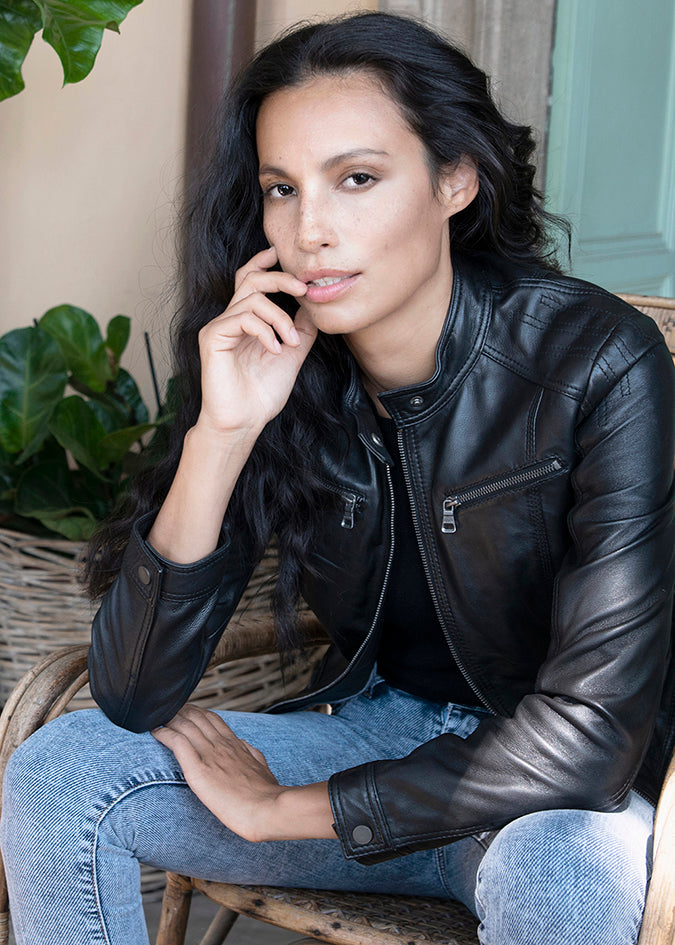Giubbino in vera pelle stile biker con tamponatura a mano con colletto alla coreana con cinturino.