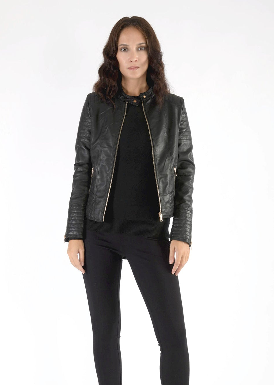 Giubbino in ecopelle in stile biker. Realizzato con delle leggere trapuntature nelle spalle e nelle maniche per donare un effetto più rock.