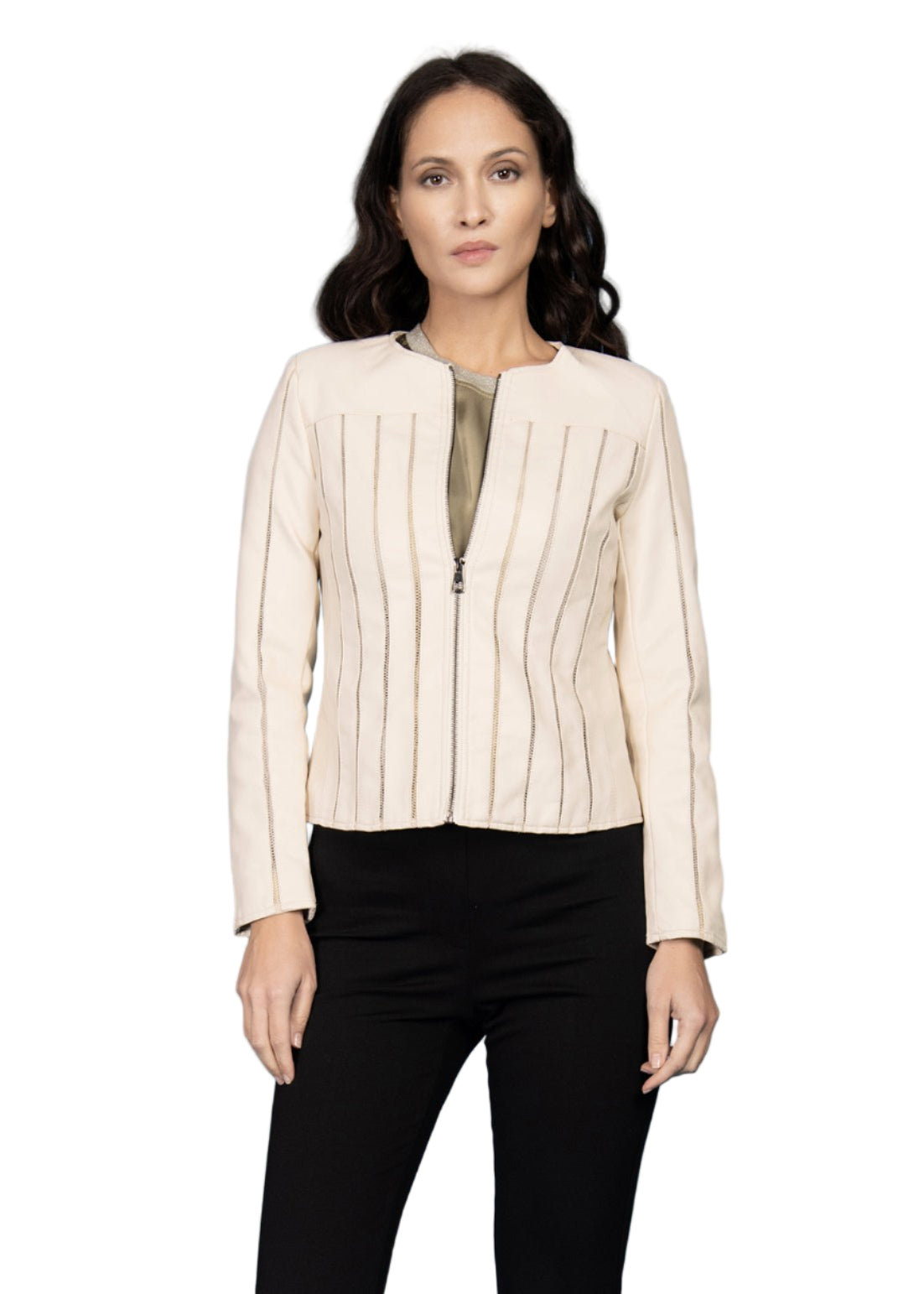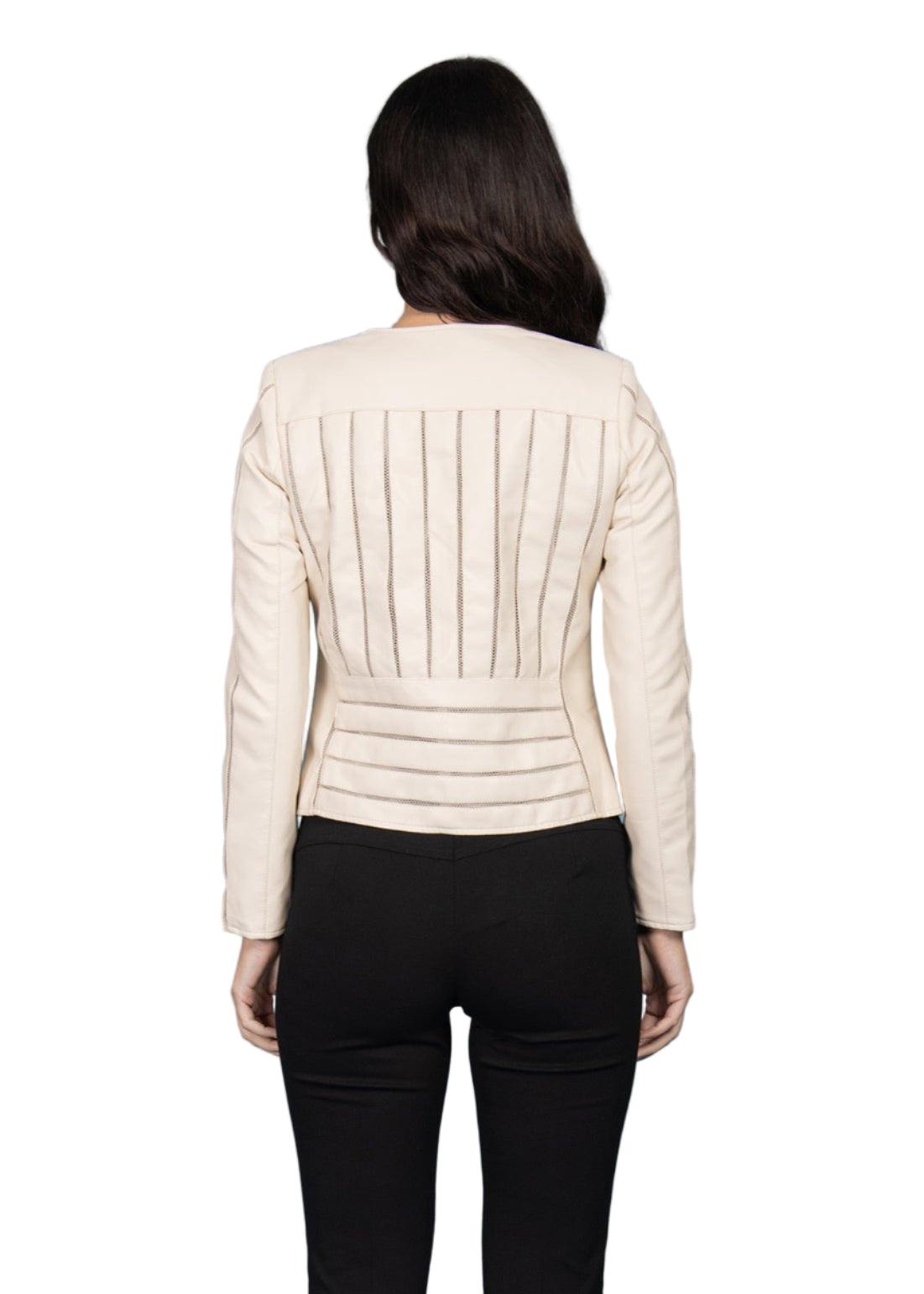 Giubbino in ecopelle senza collor con profili cociture traforate.