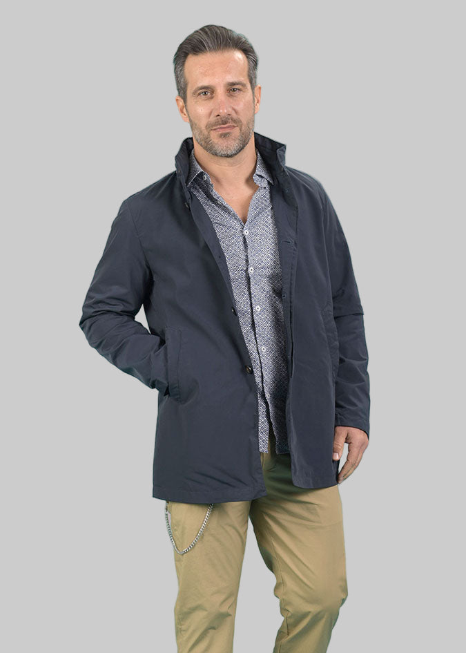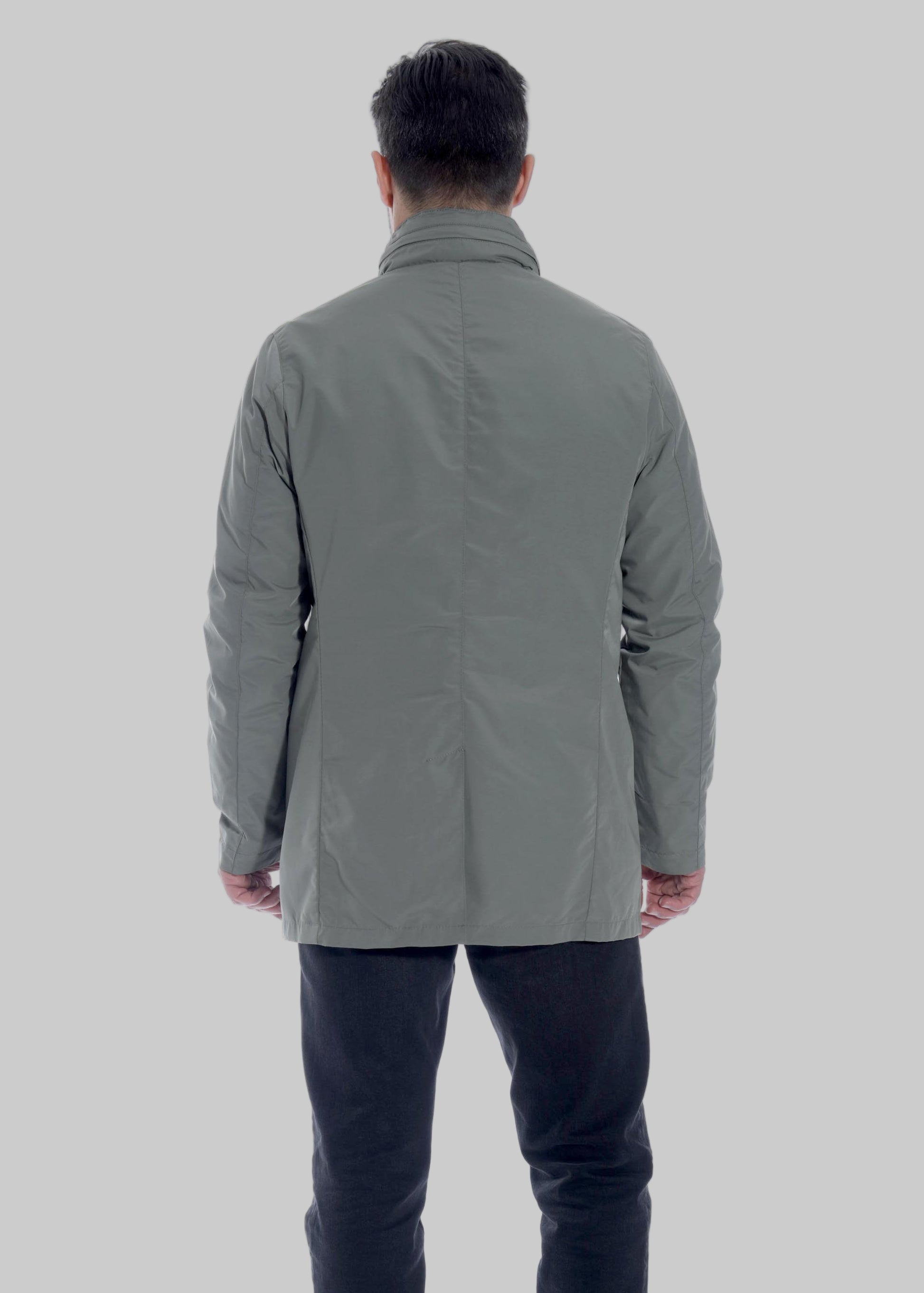 Giubbino in tessuto impermeabile colletto alla coreana con all' interno cappuccio leggero.