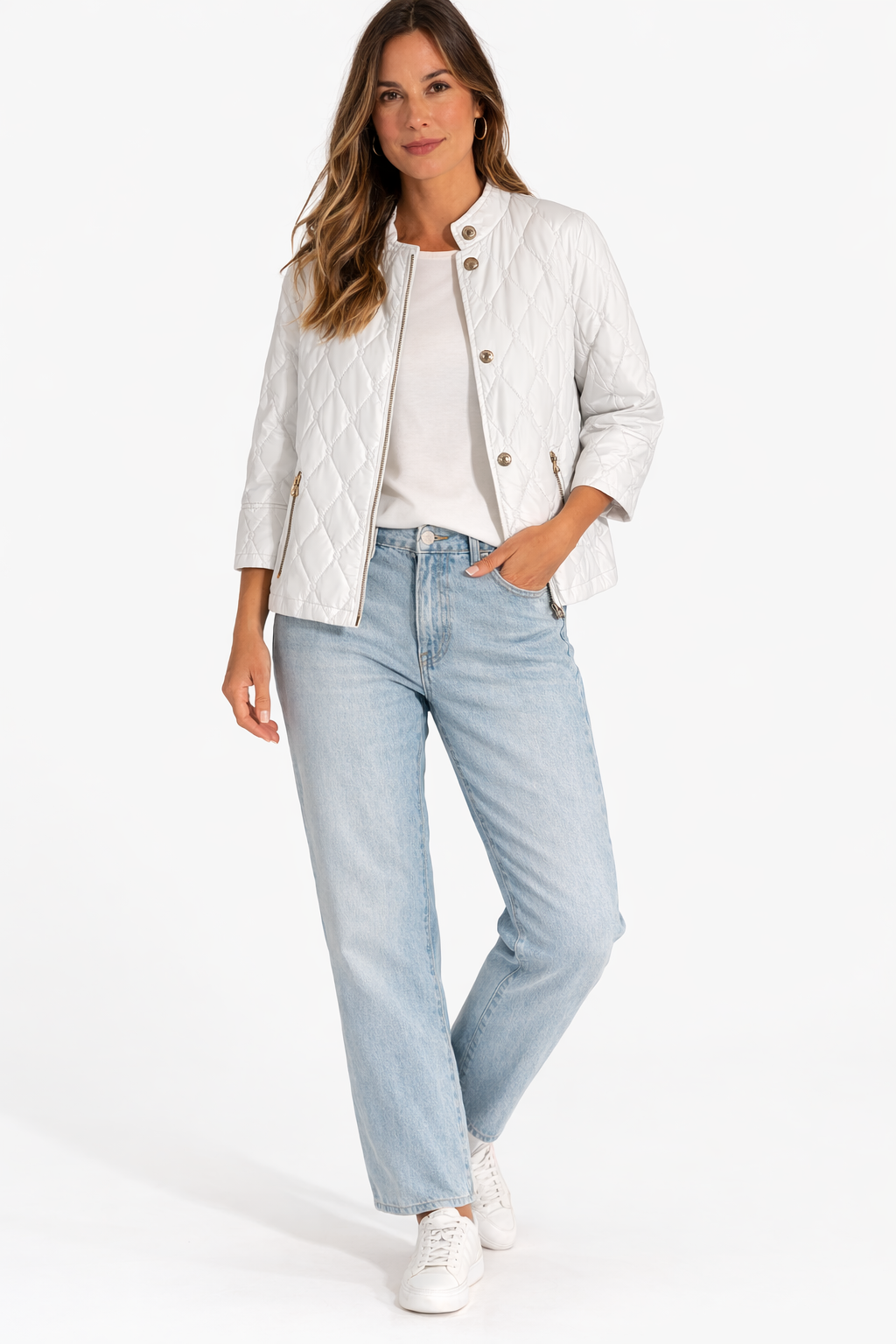 - I dettagli metallici donano luminosità al capo mentre la linea pulita
