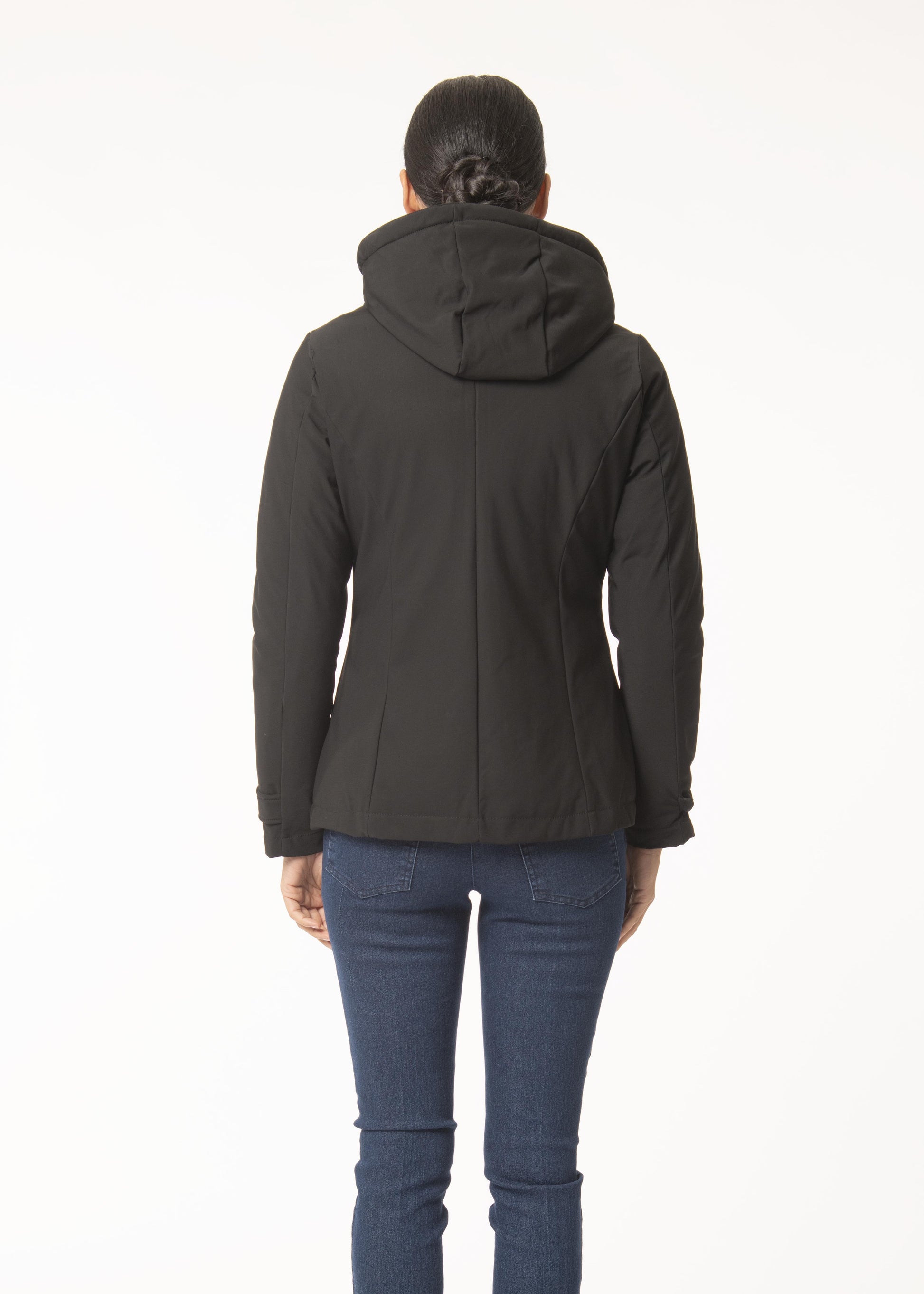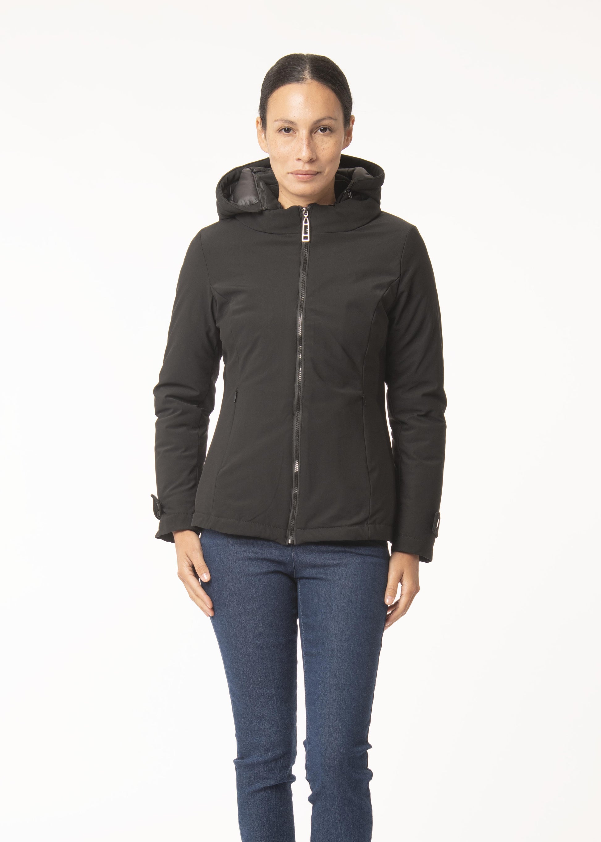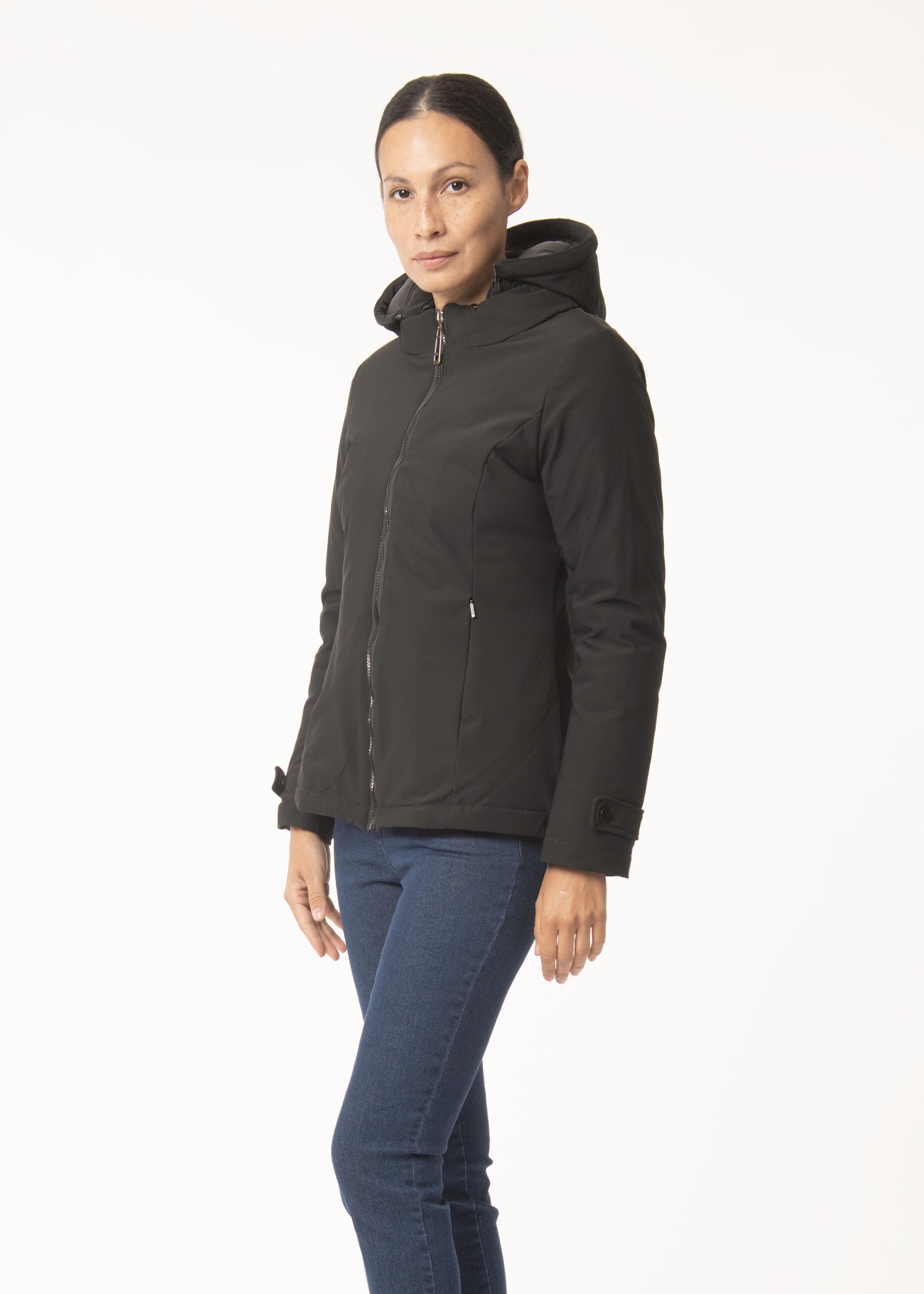 Giubbino in tessuto tecnico con imbottitura in ecopiuma e cappuccio staccabile.