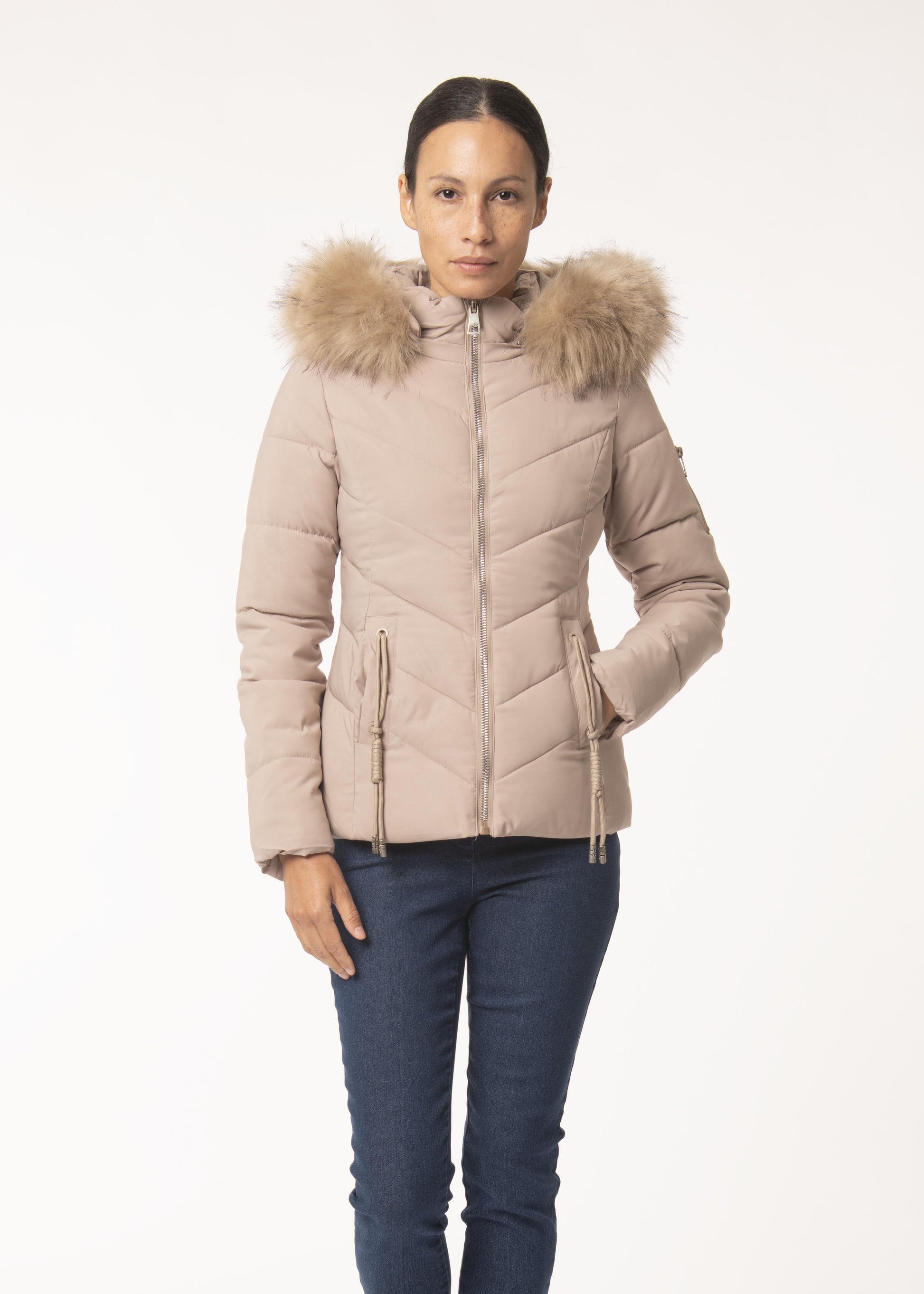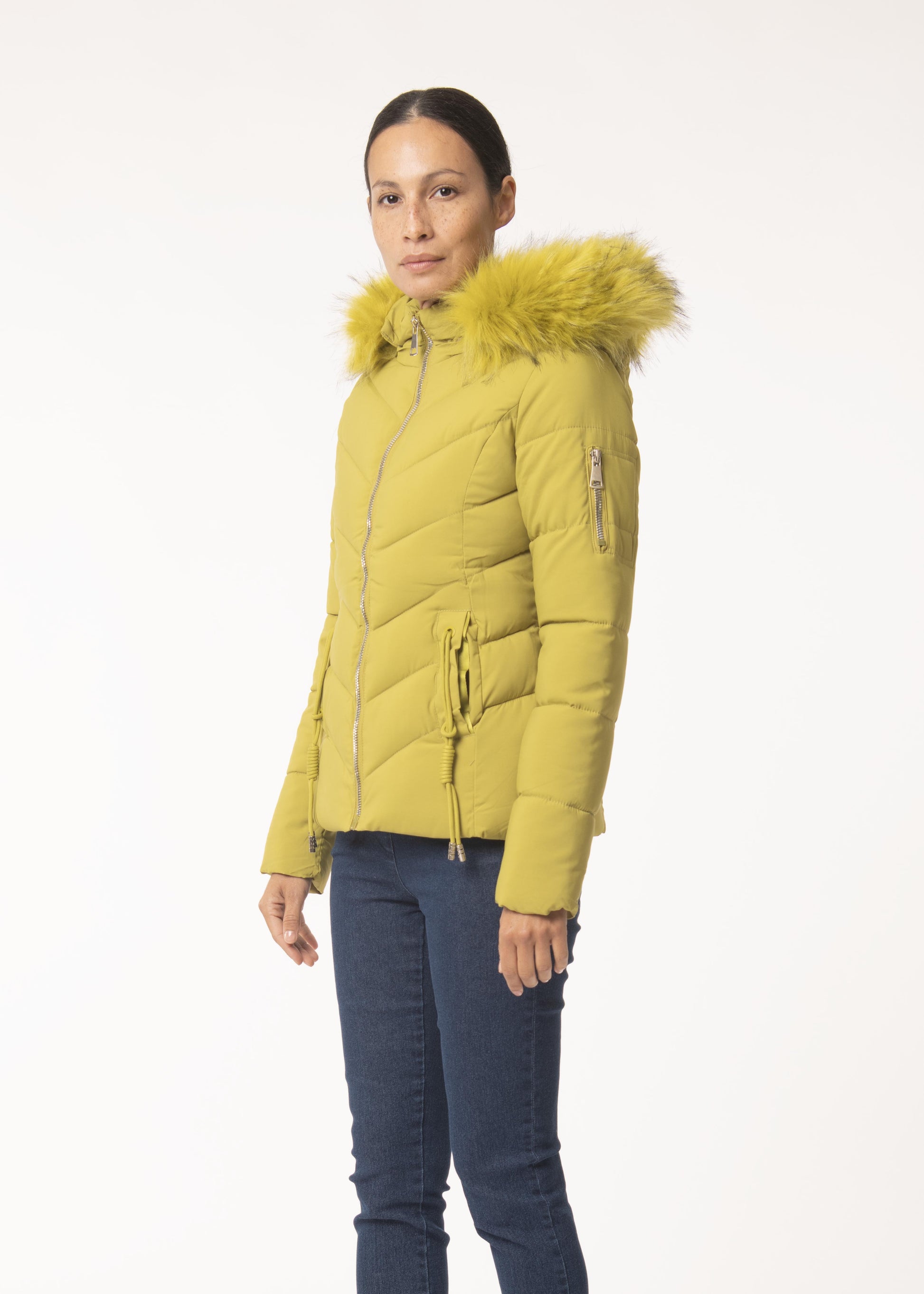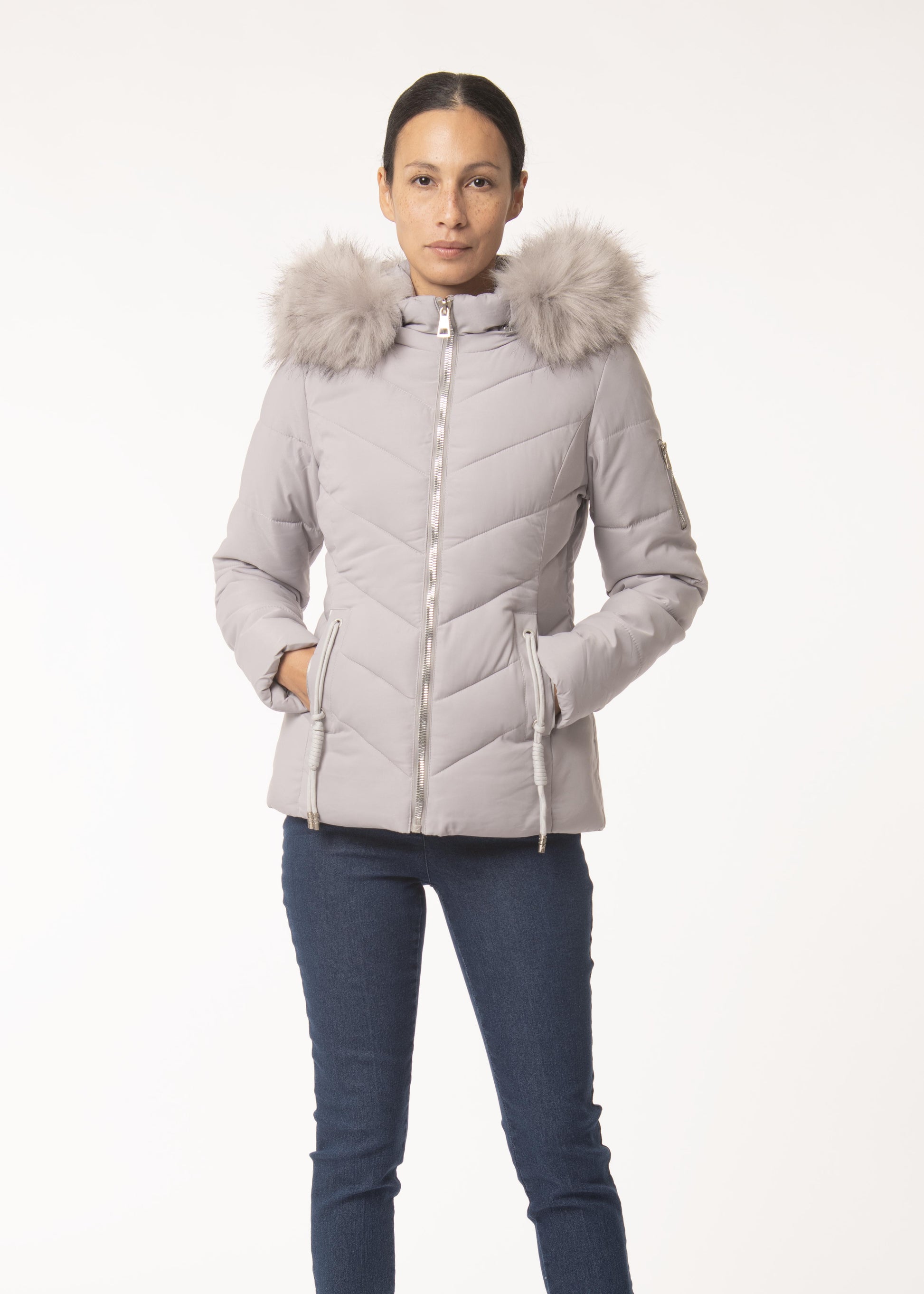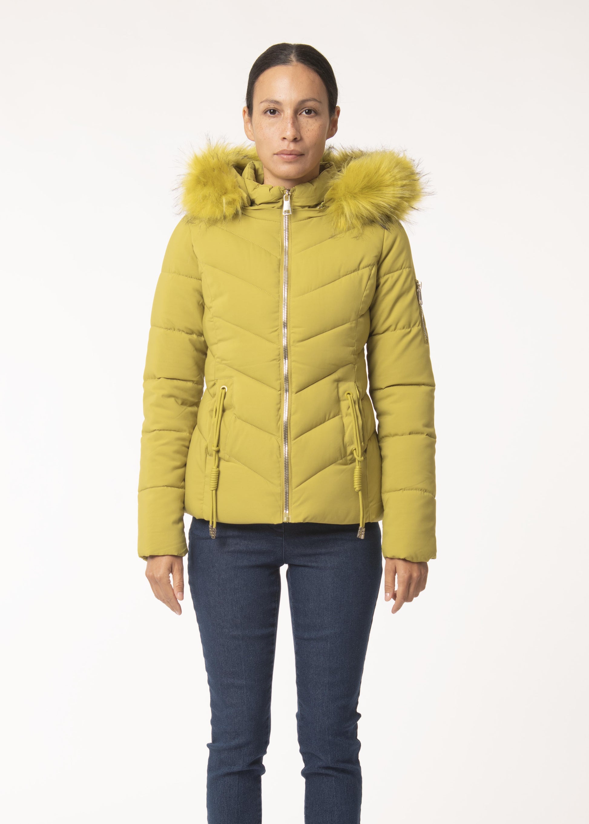 Giubbino in tessuto tecnico con imbottitura in ecopiuma cappuccio staccabile e bordura staccabile.