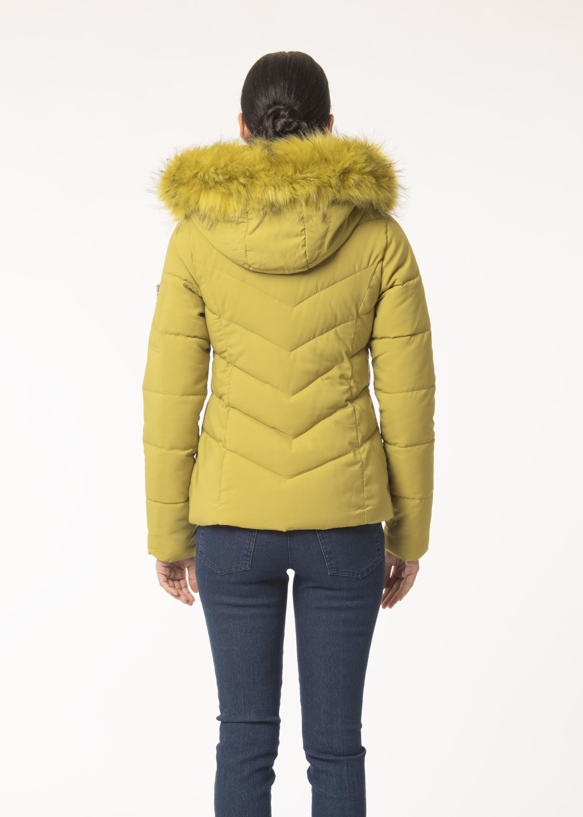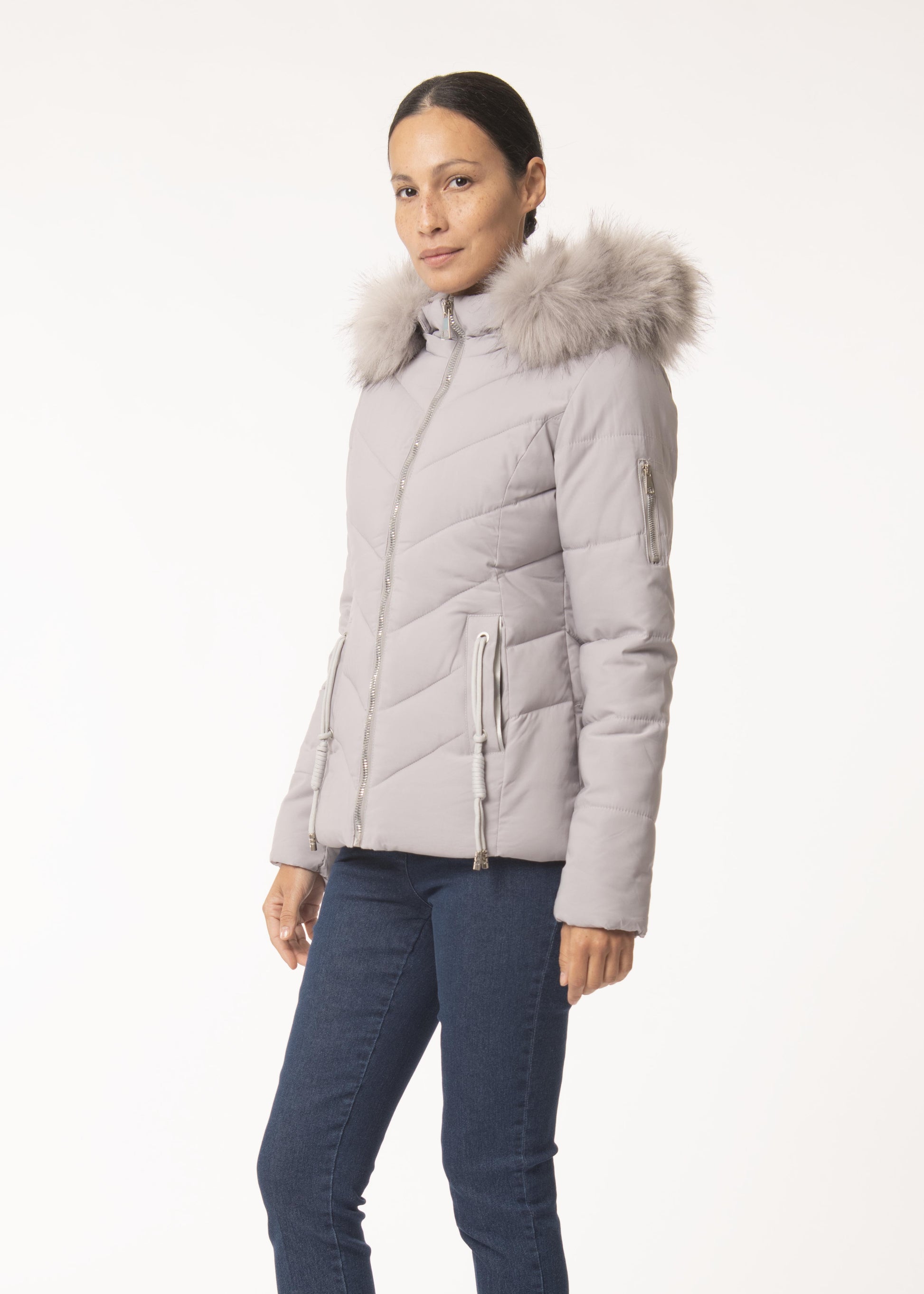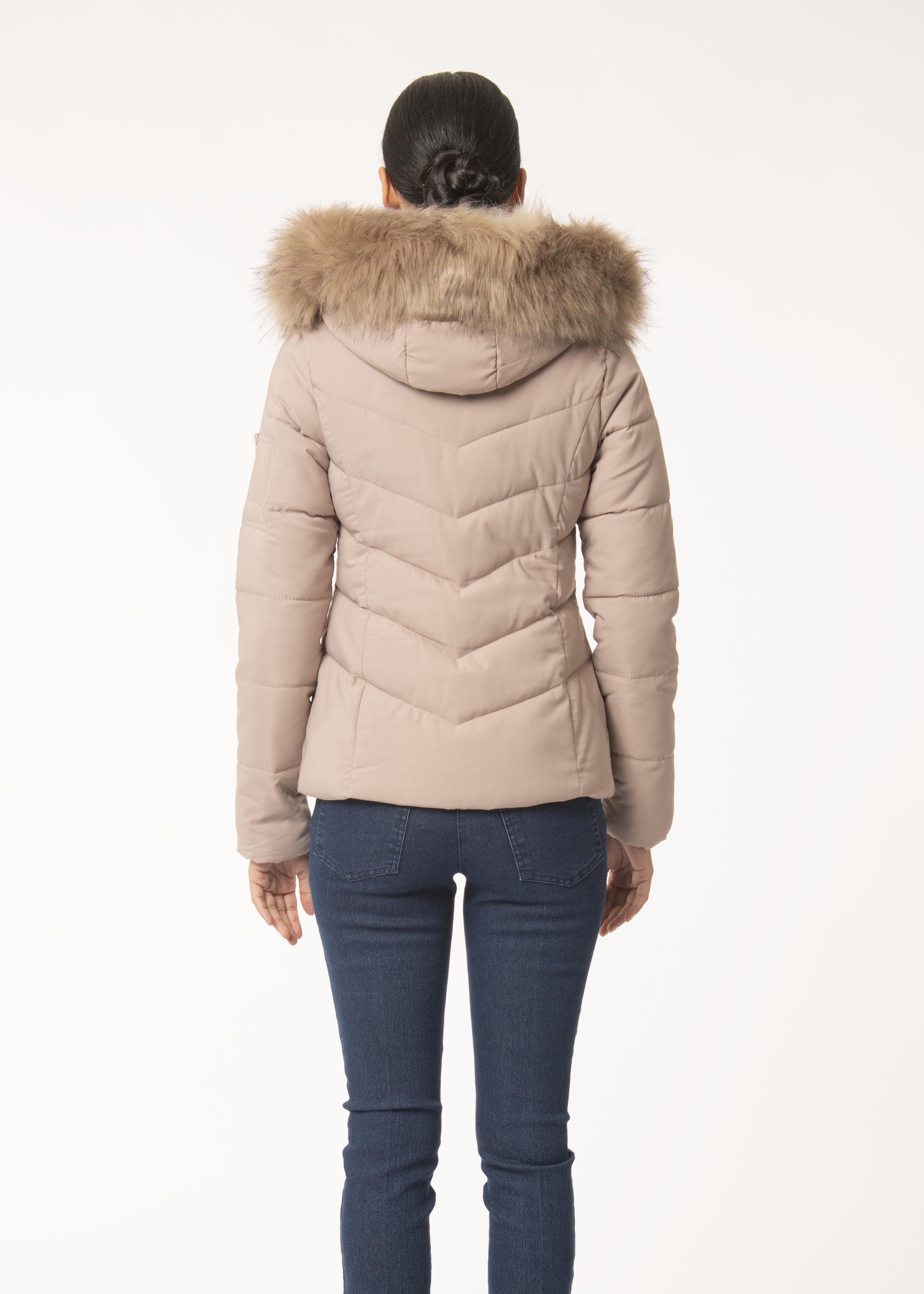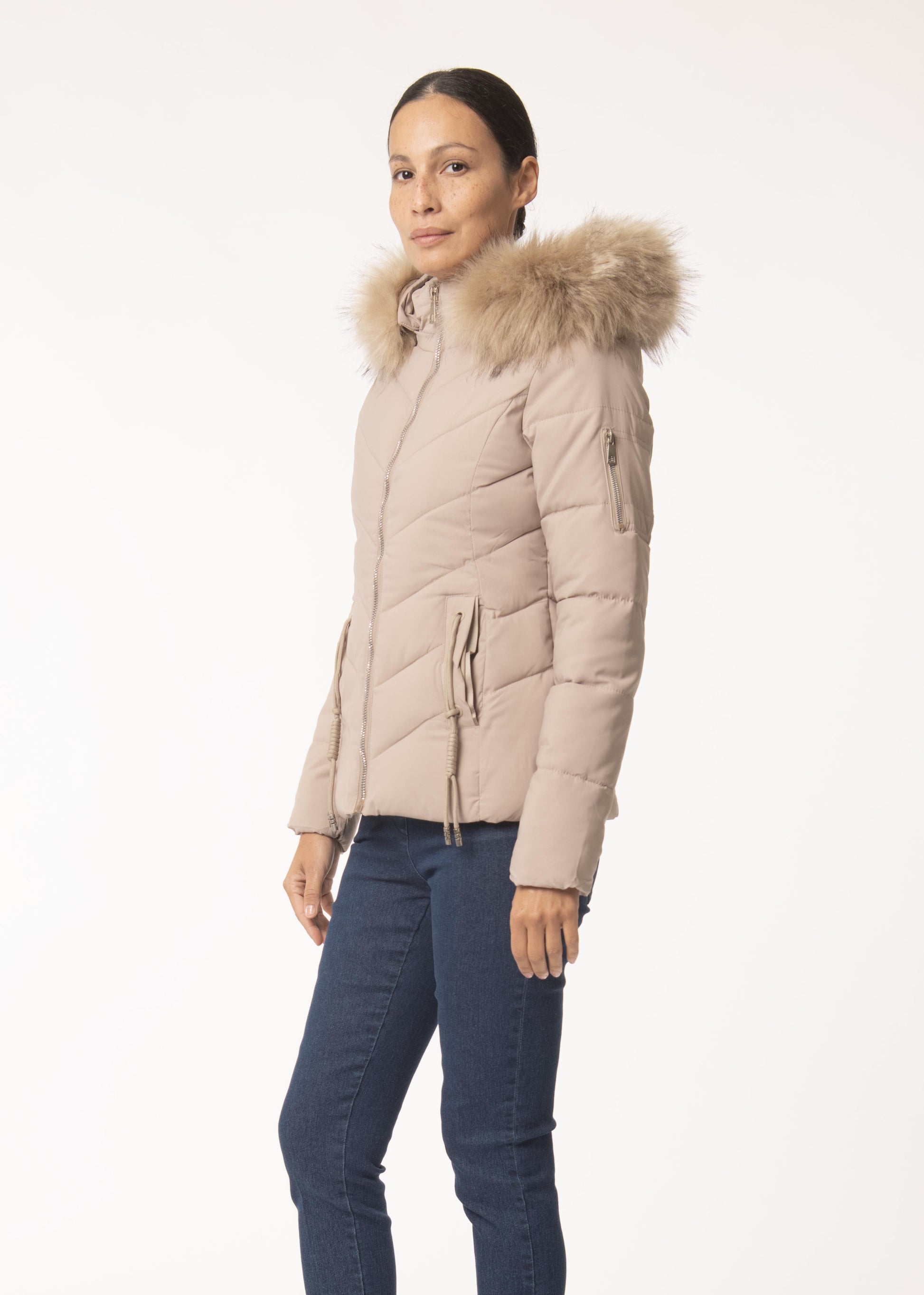 Giubbino in tessuto tecnico con imbottitura in ecopiuma cappuccio staccabile e bordura staccabile.