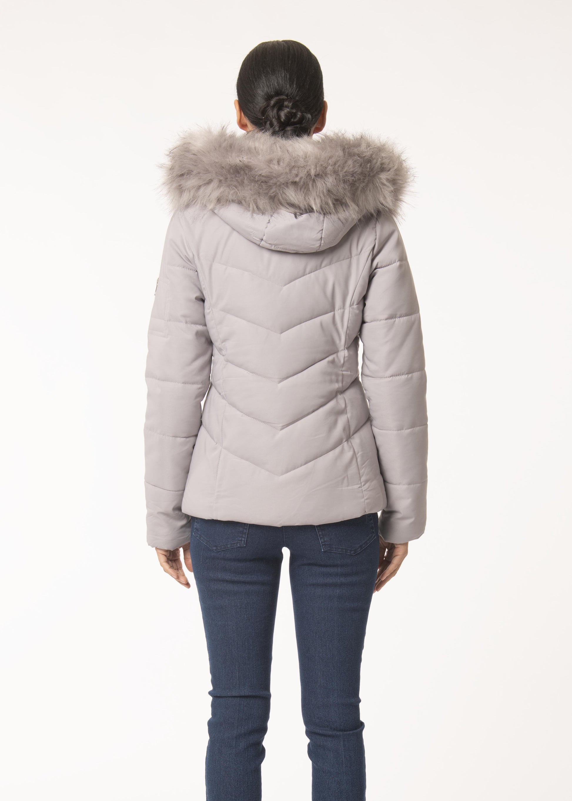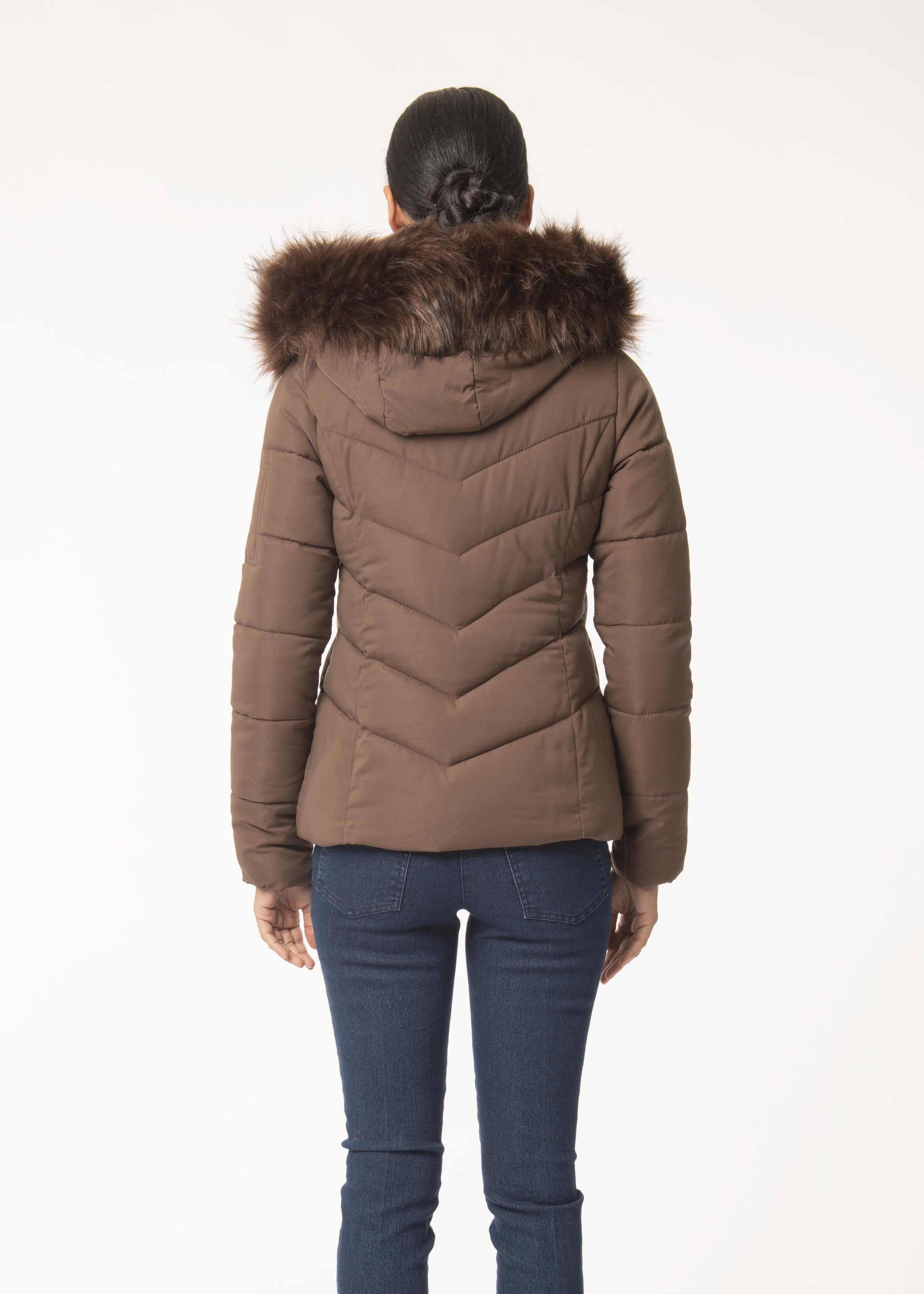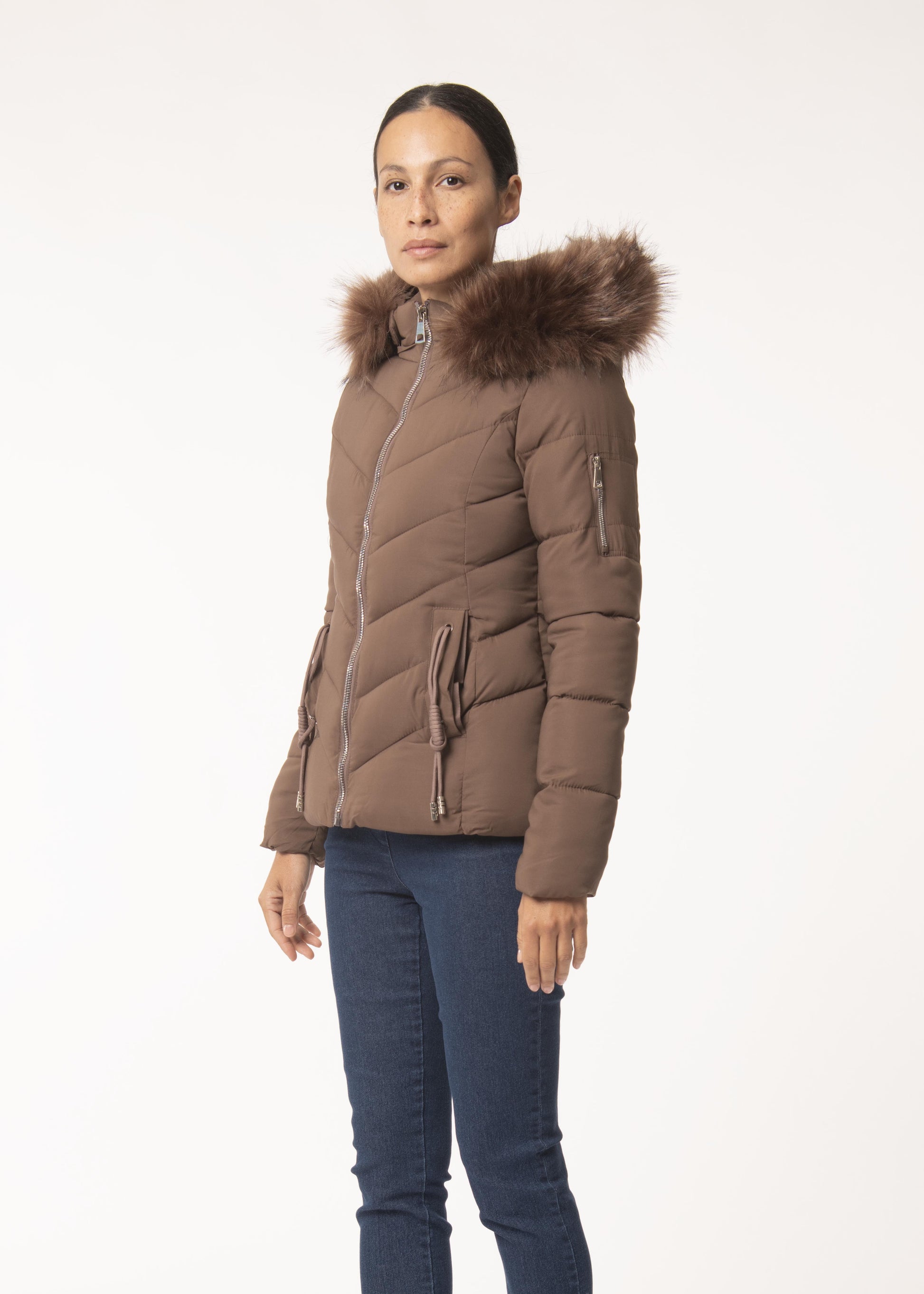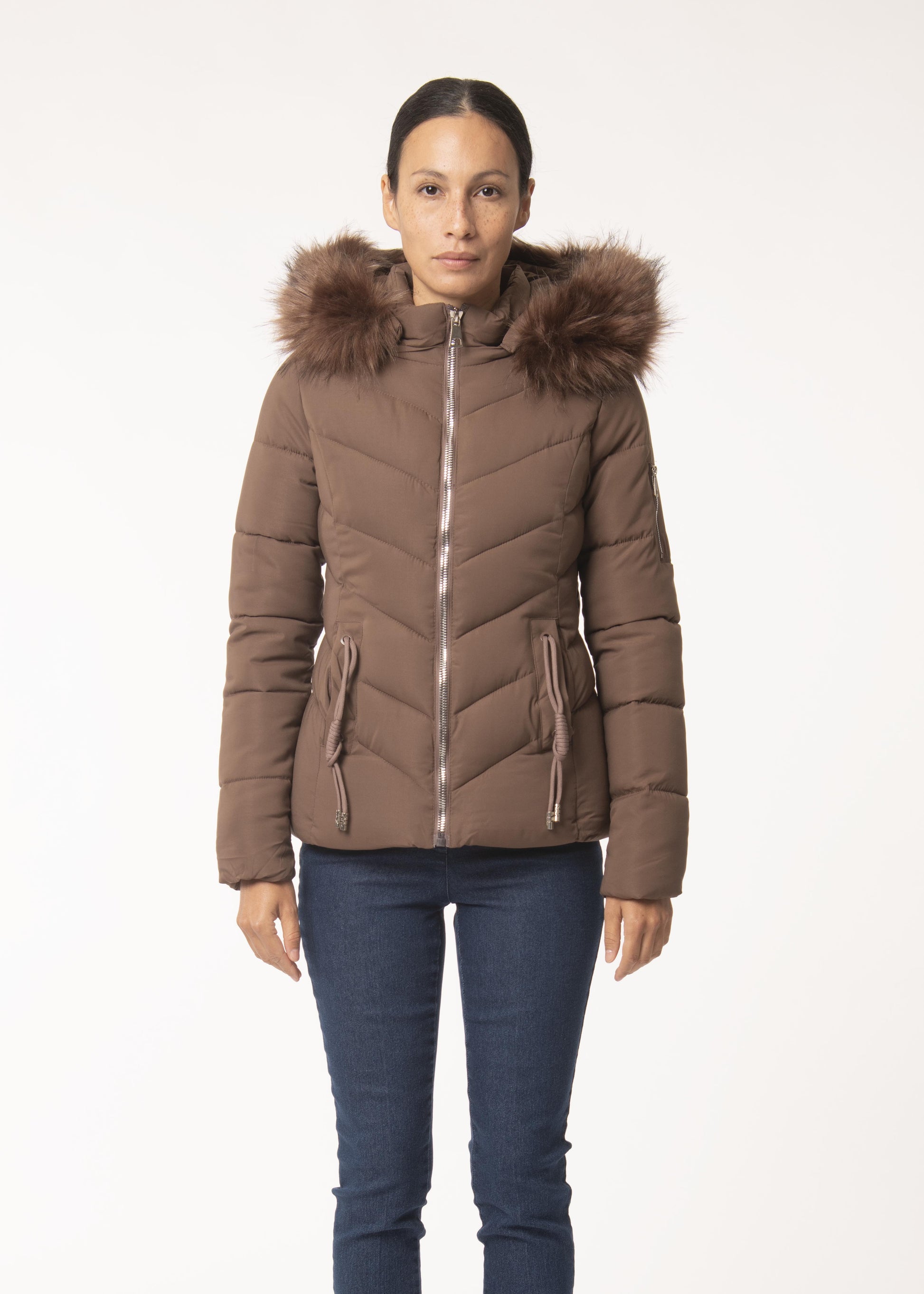 Giubbino in tessuto tecnico con imbottitura in ecopiuma cappuccio staccabile e bordura staccabile.