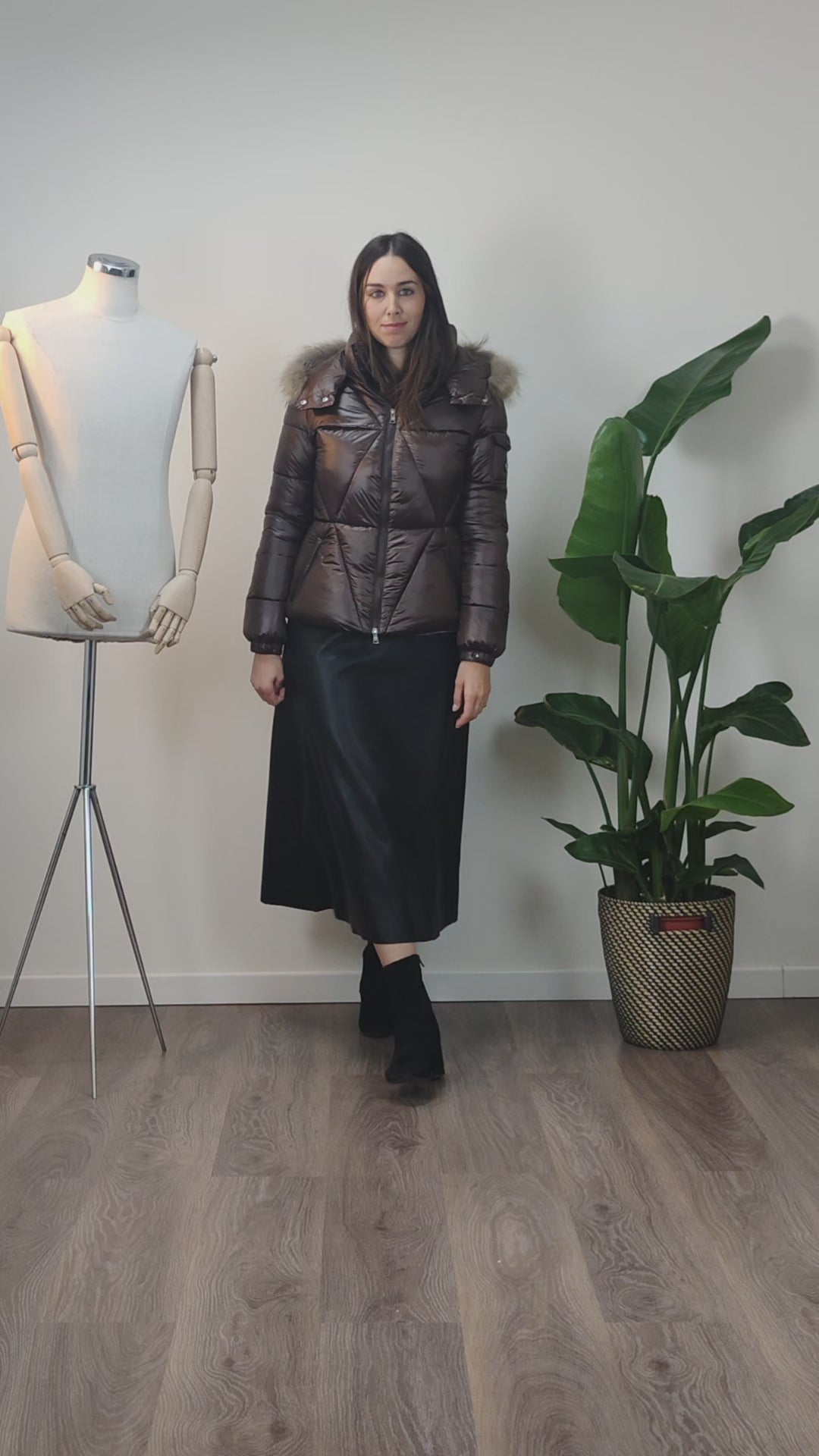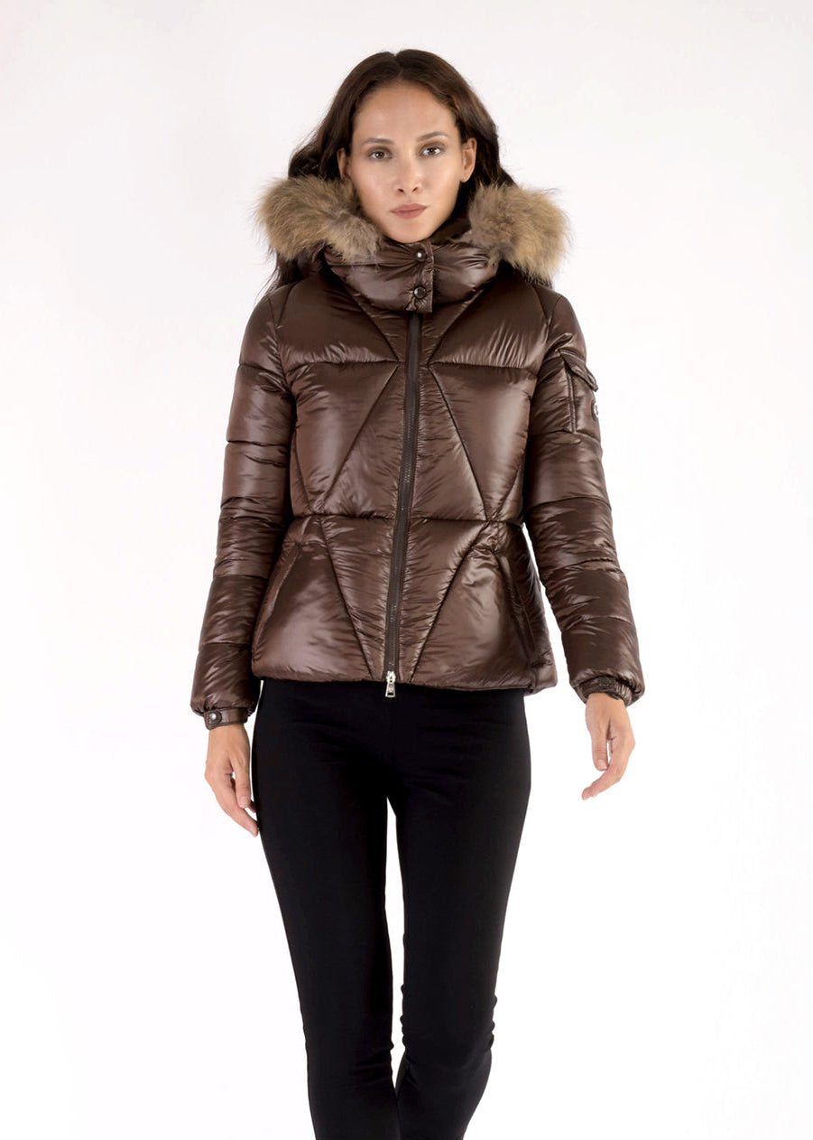 Giubbino in tessuto tecnico con imbottitura in ecopiuma cappuccio staccabile e bordo in pelliccia.