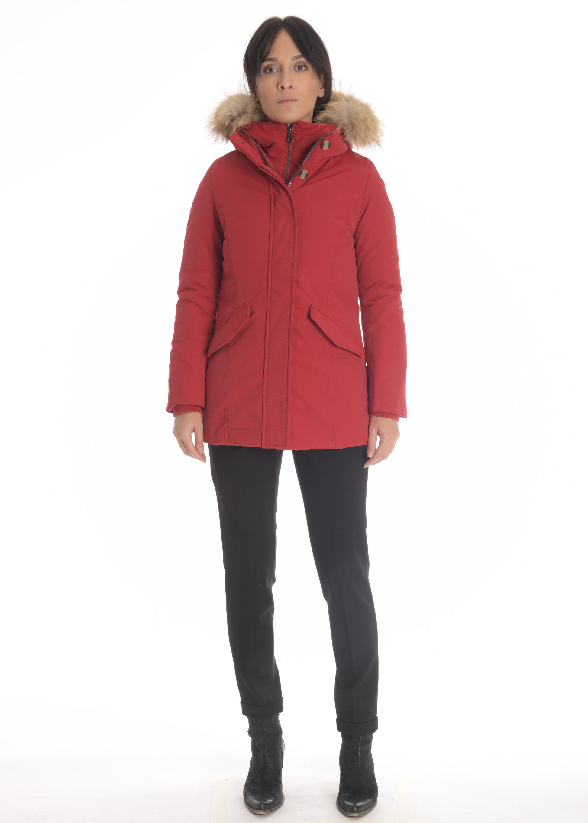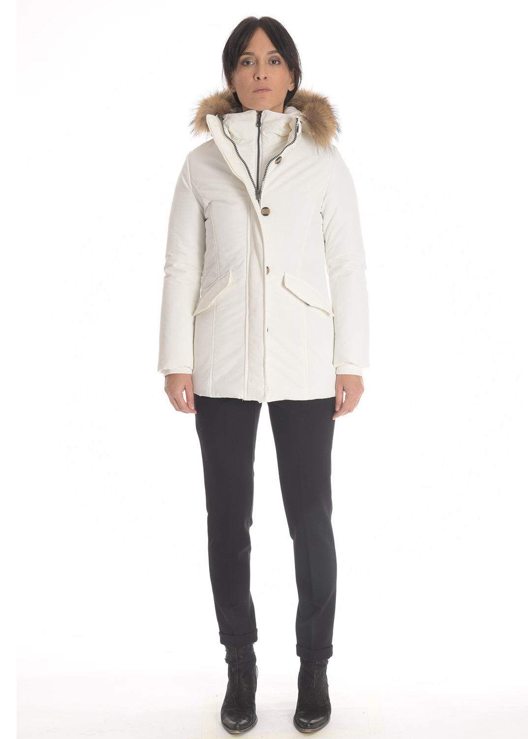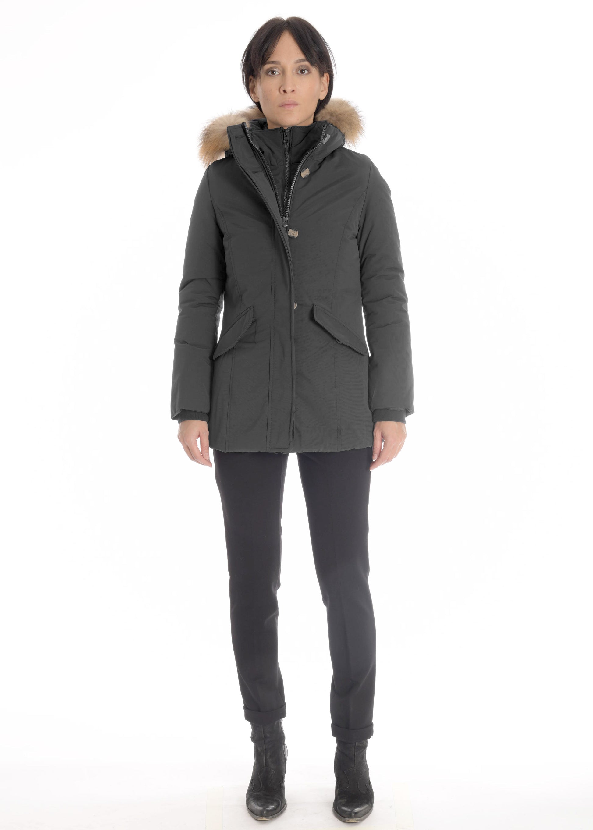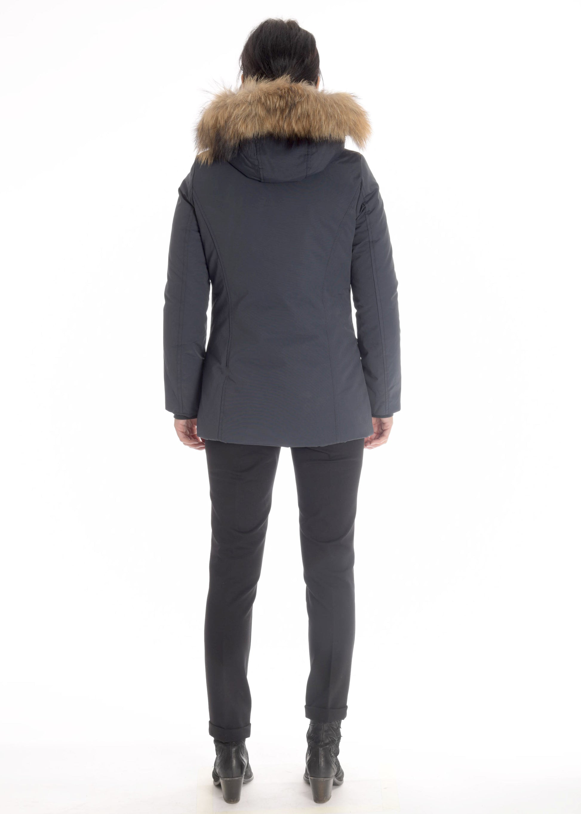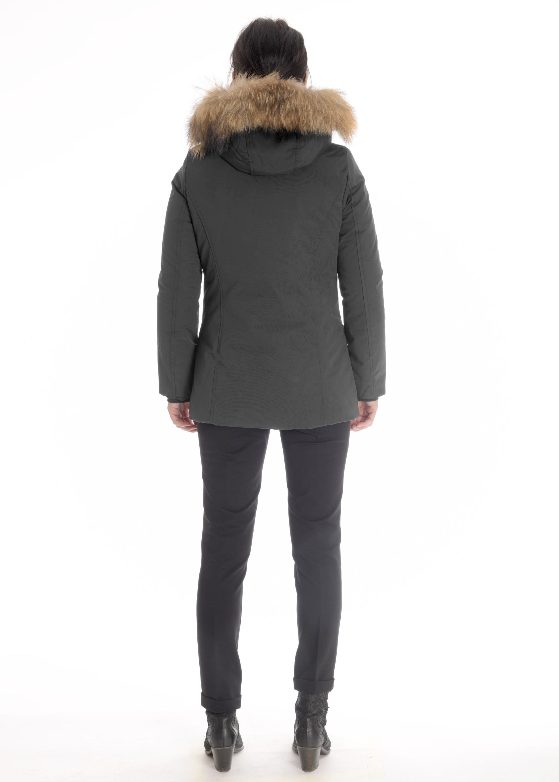 Giaccone imbottito in ecopiuma con cappuccio staccabile con bordo in vera pelliccia