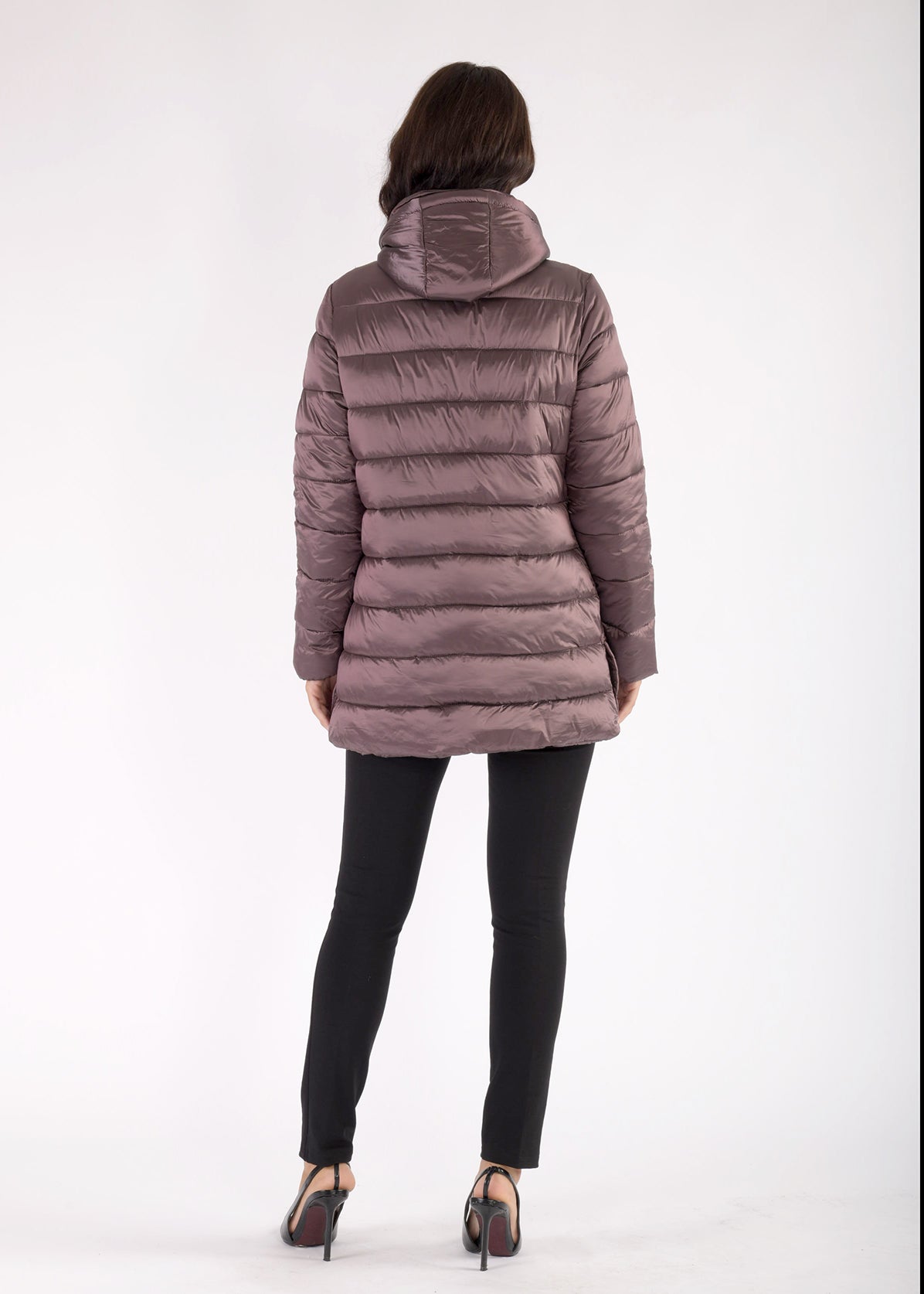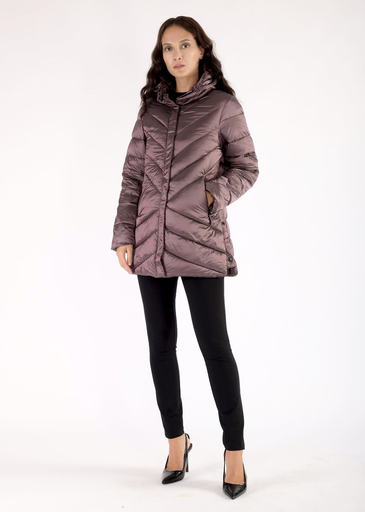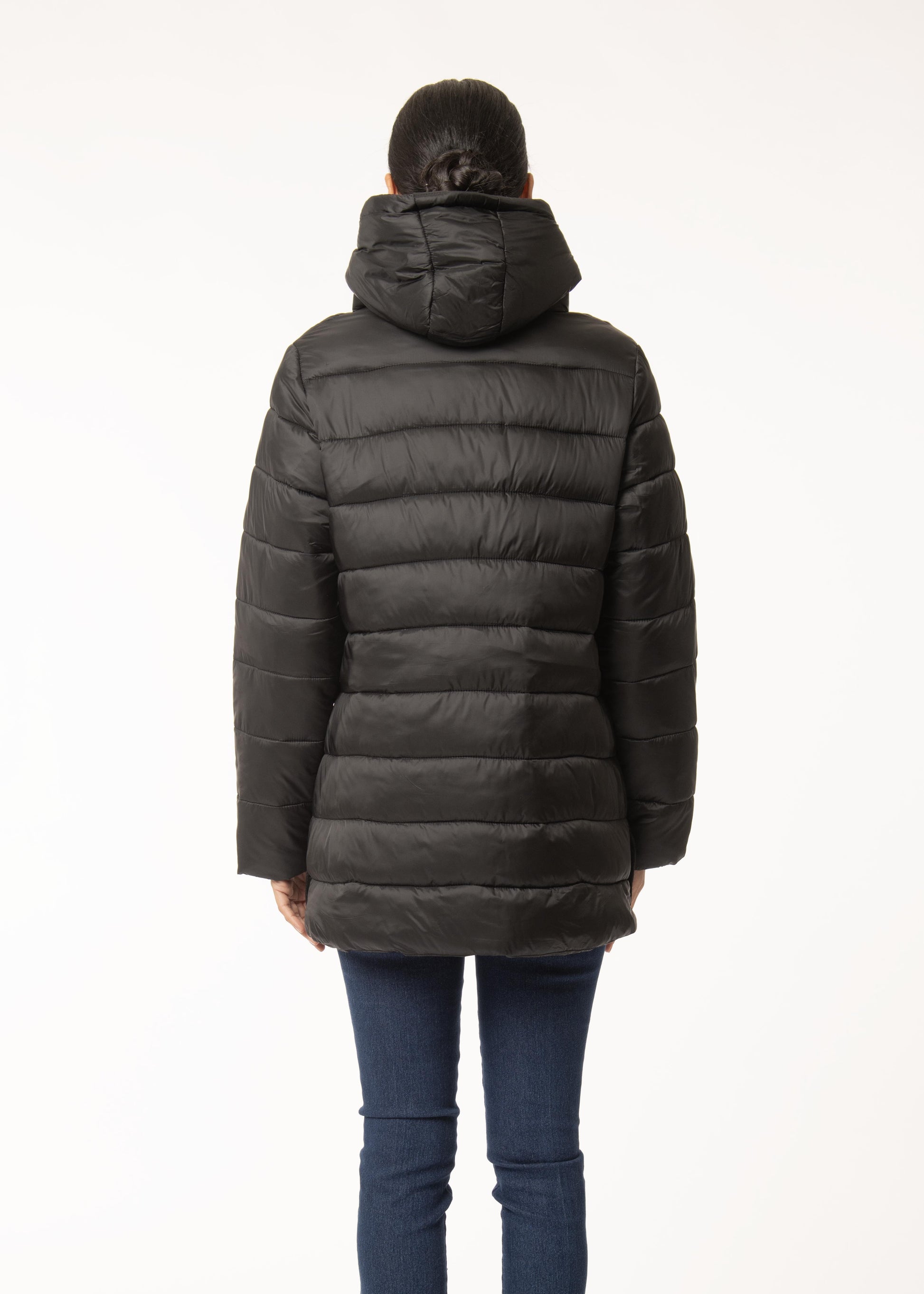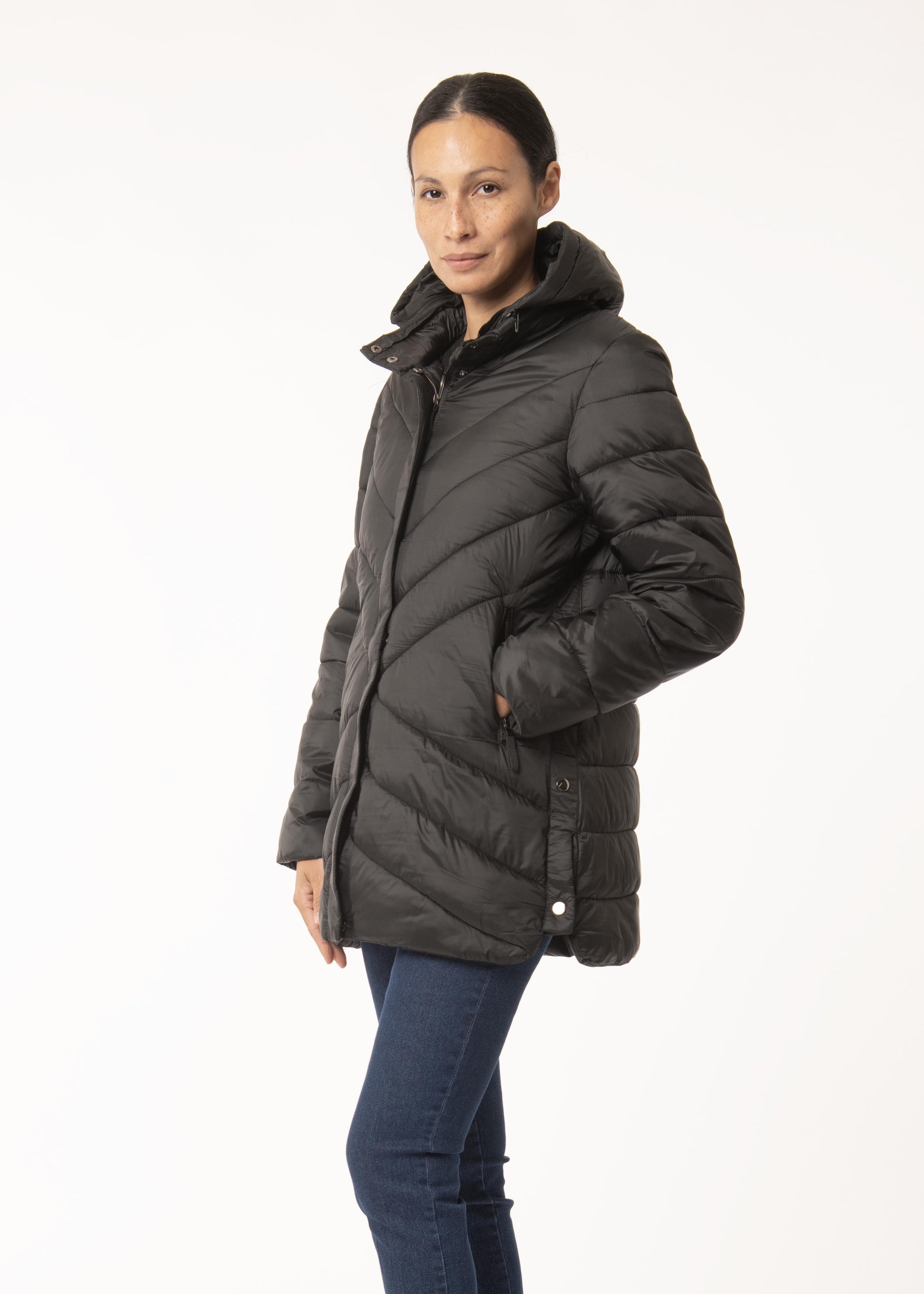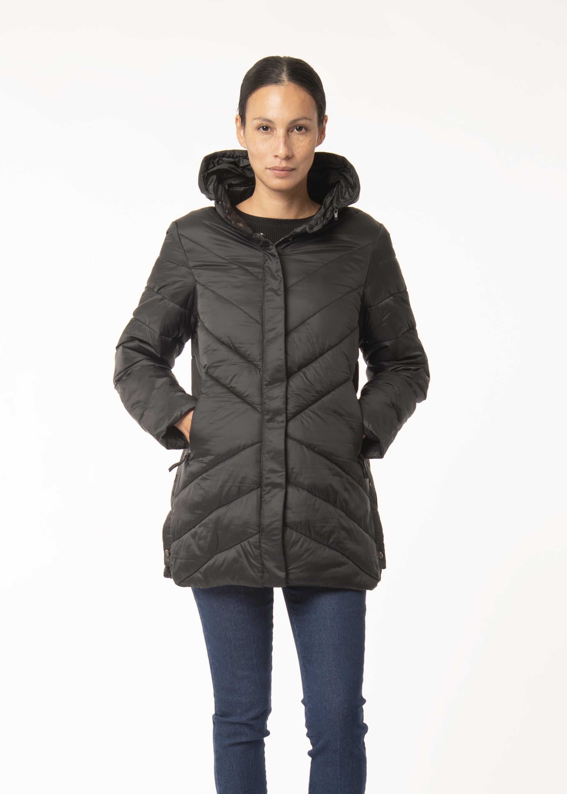 Giaccone trapuntato imbottito con ovatta termica in ecopiuma cappuccio staccabile con coulisse tessuto soft-touch zip centrale con patta