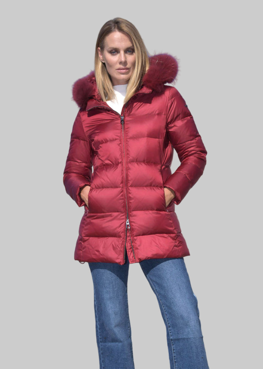 Giaccone imbottito in ecopiuma con cappuccio e bordo in pelliccia naturale.