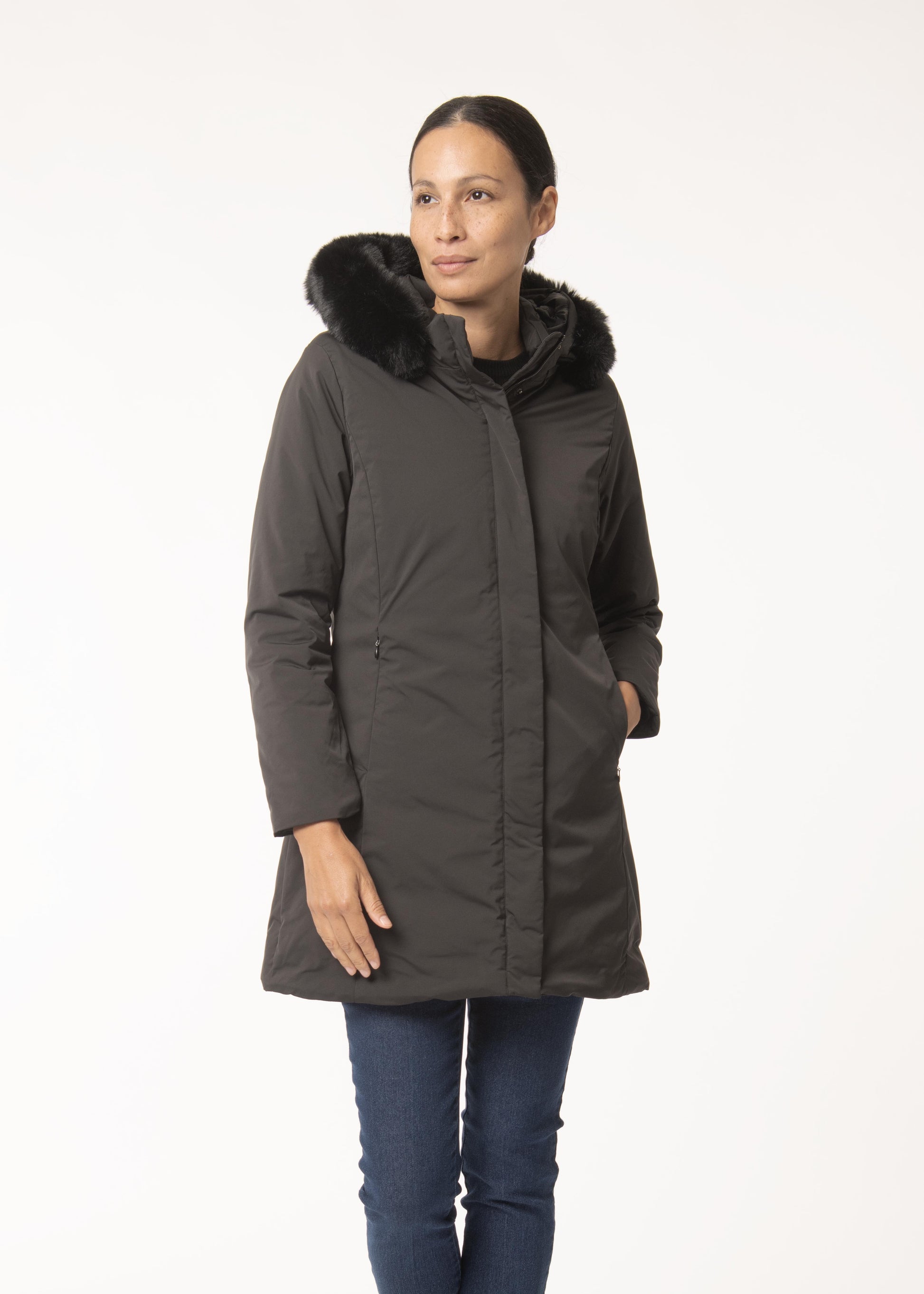 Giaccone in tessuto tecnico con cappuccio staccabile ed imbottitura in ecopiuma premium.