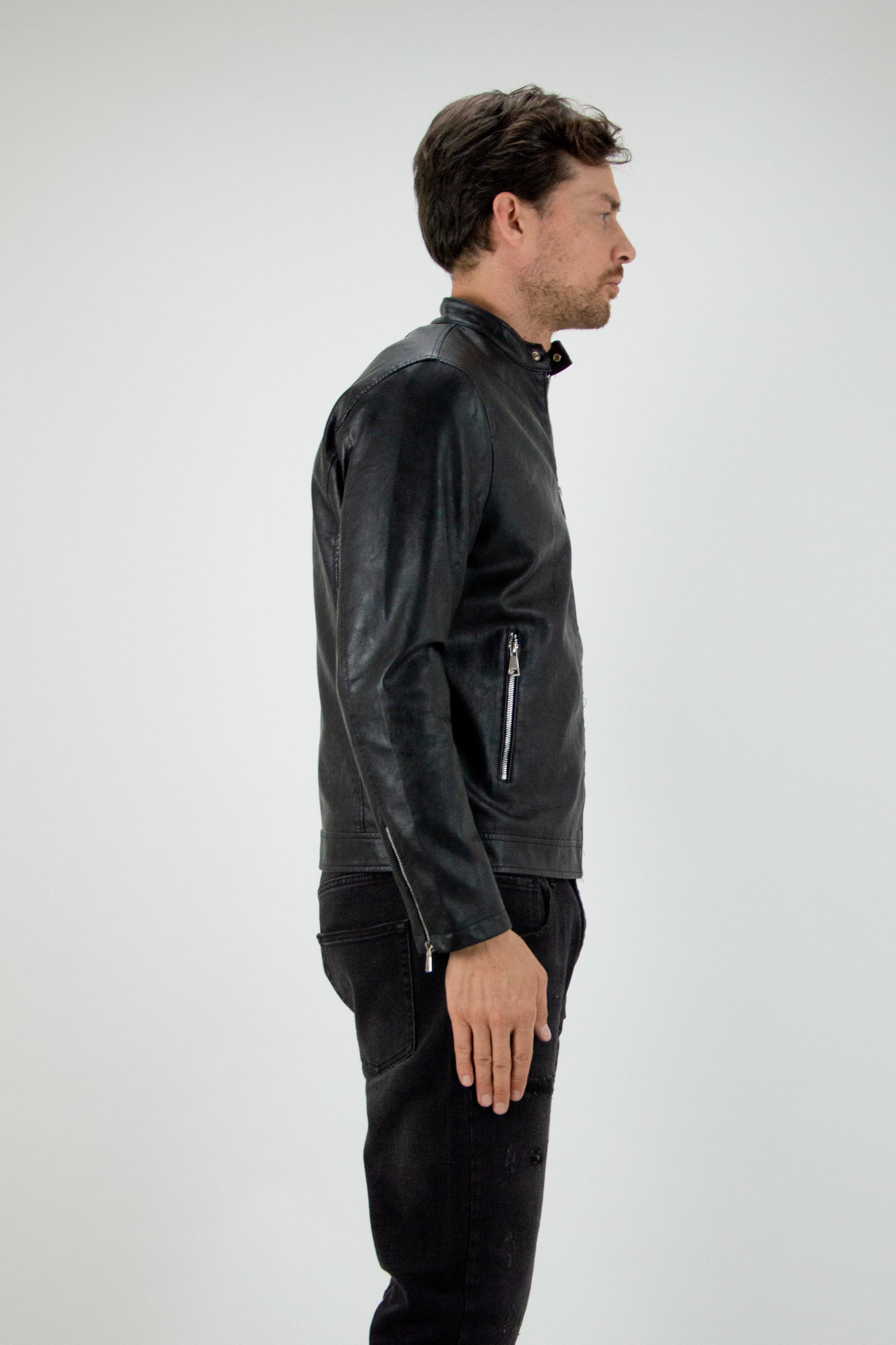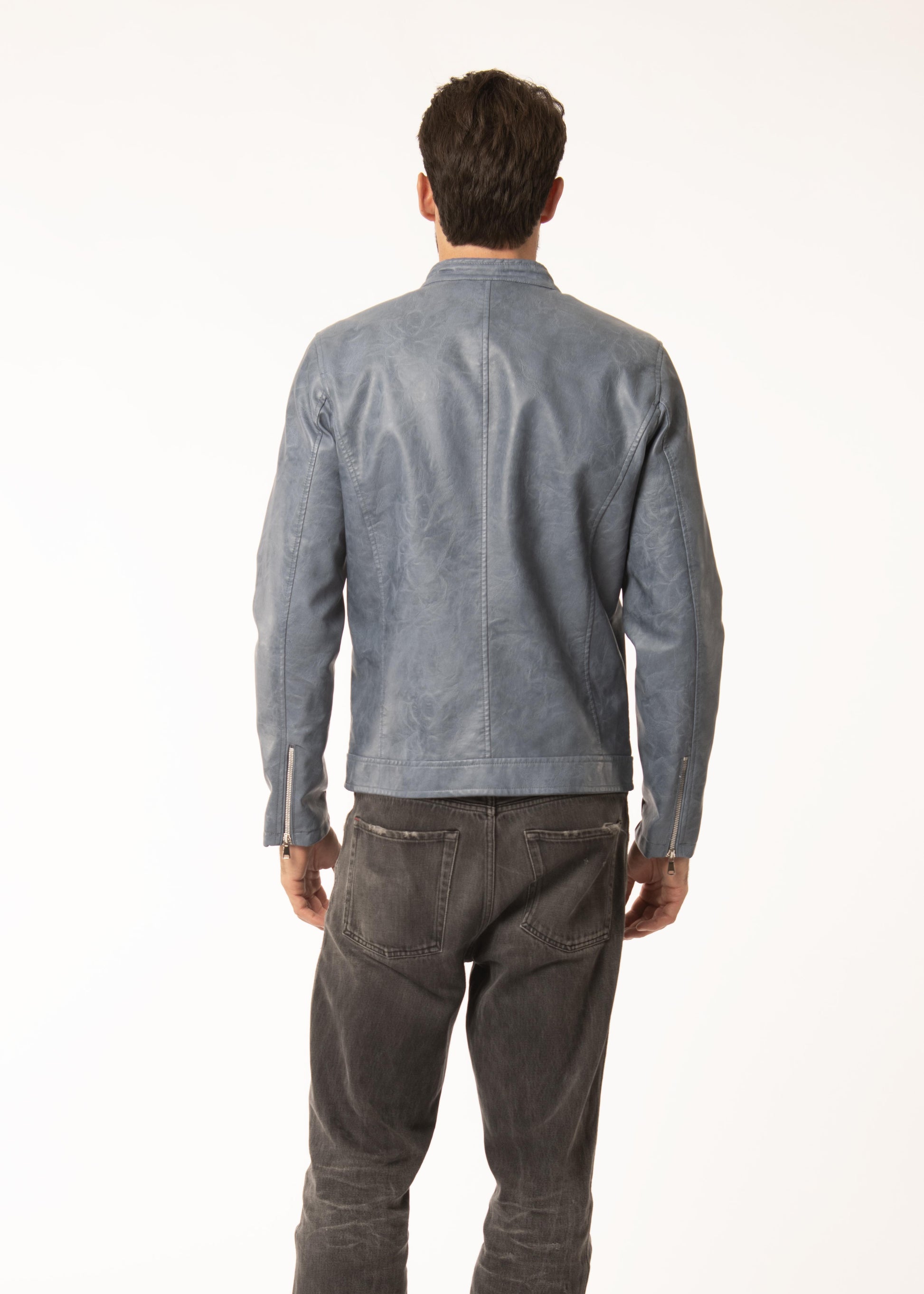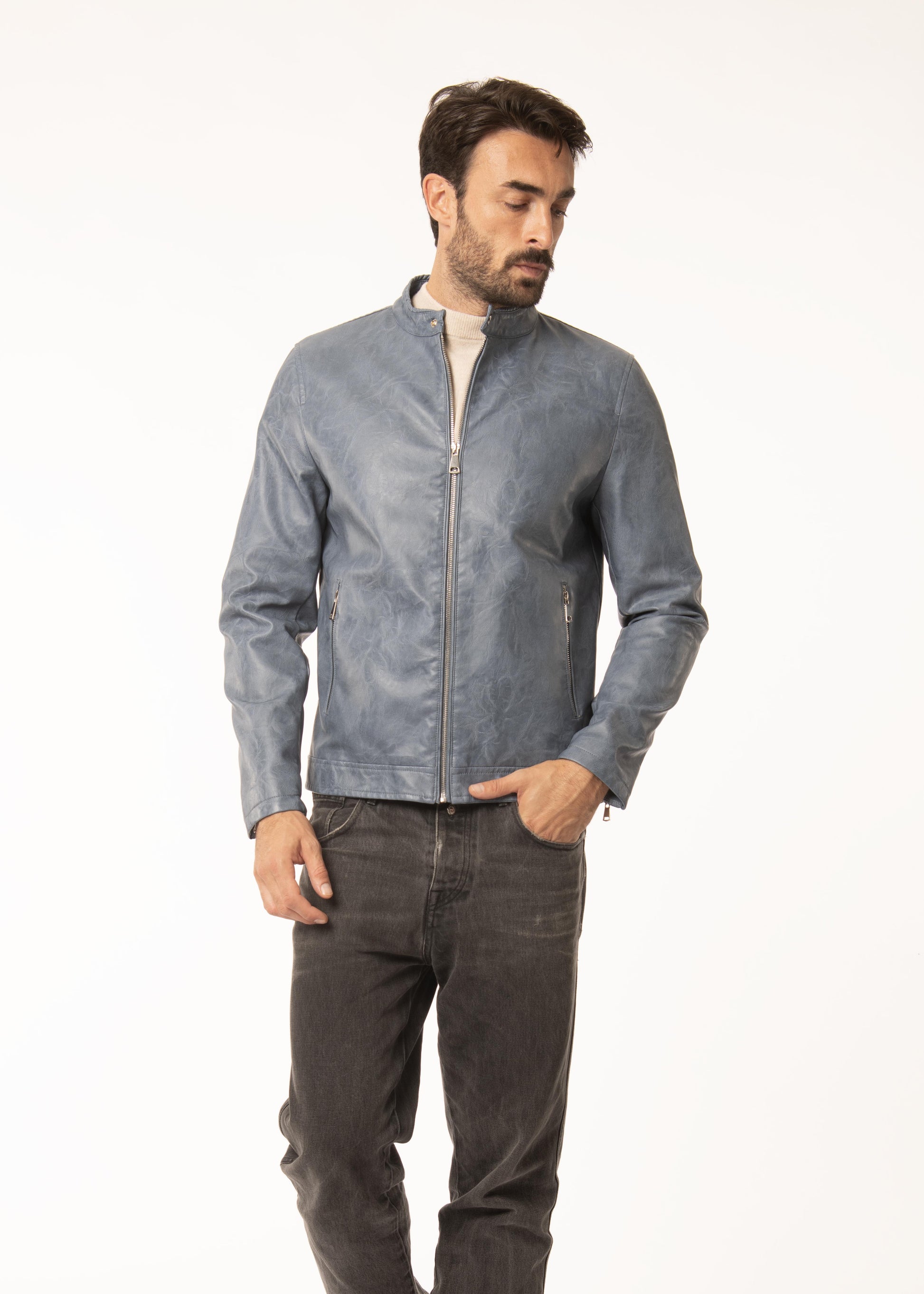 Giubbino in ecopelle con colletto alla coreana e cinturino.