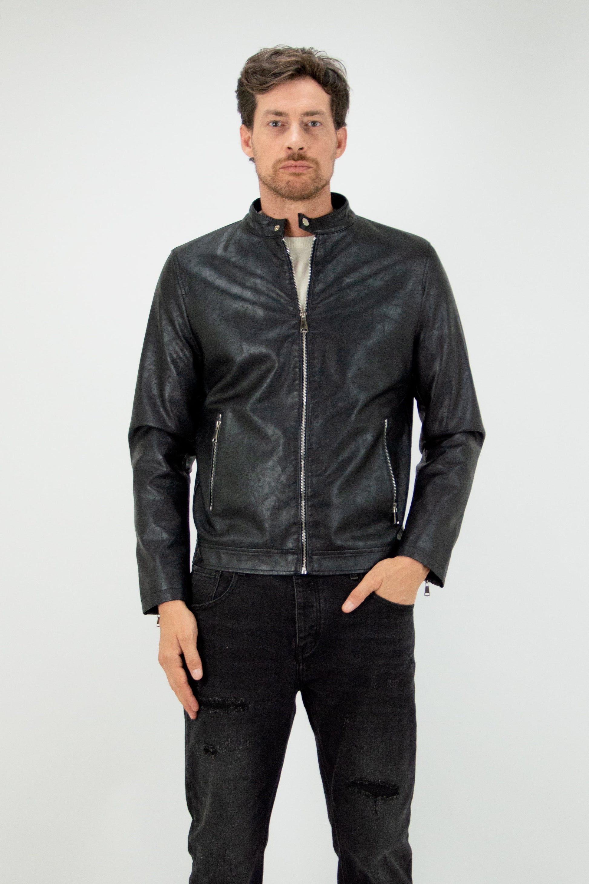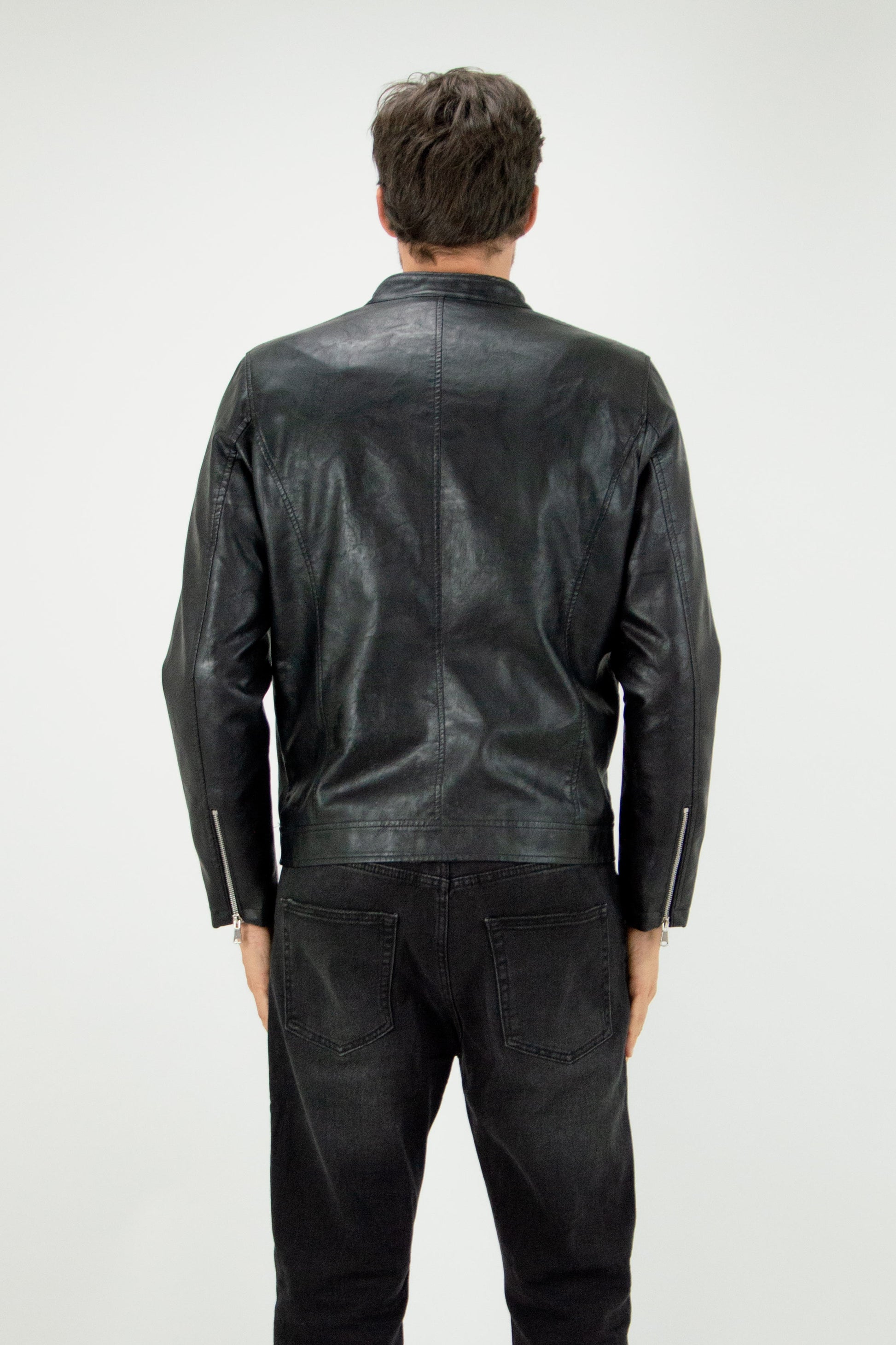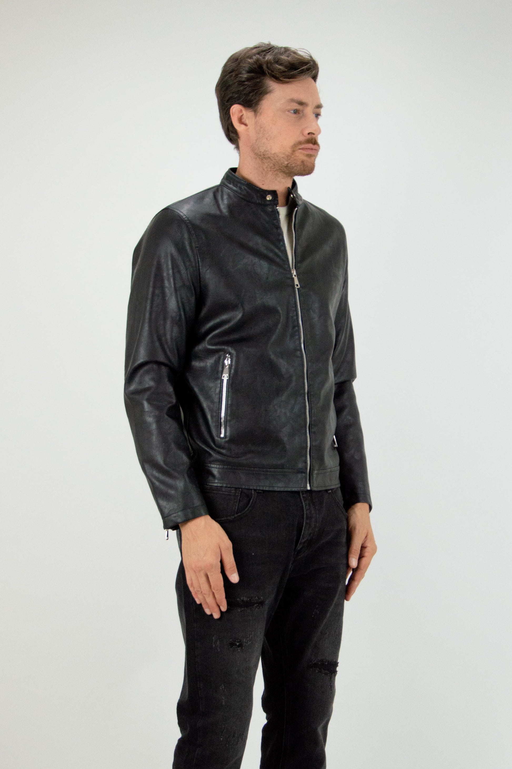 Giubbino in ecopelle con colletto alla coreana e cinturino.
