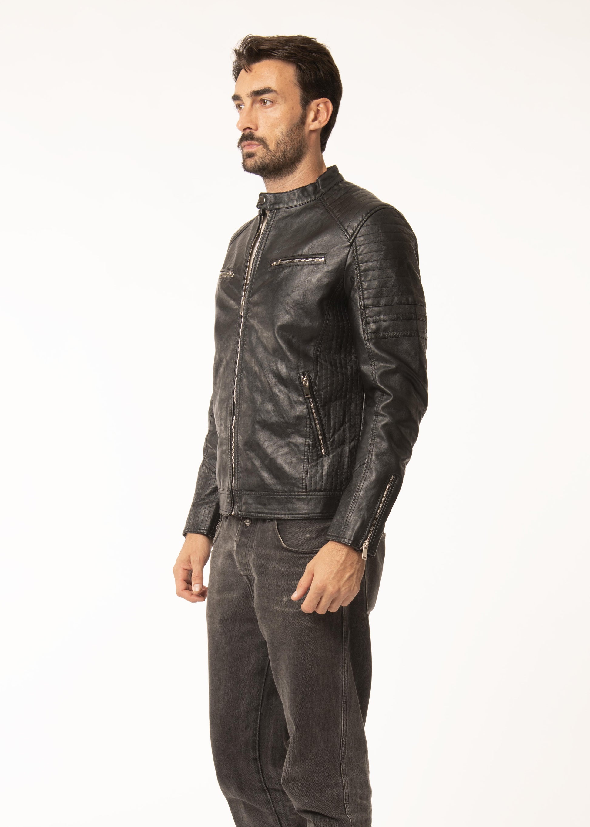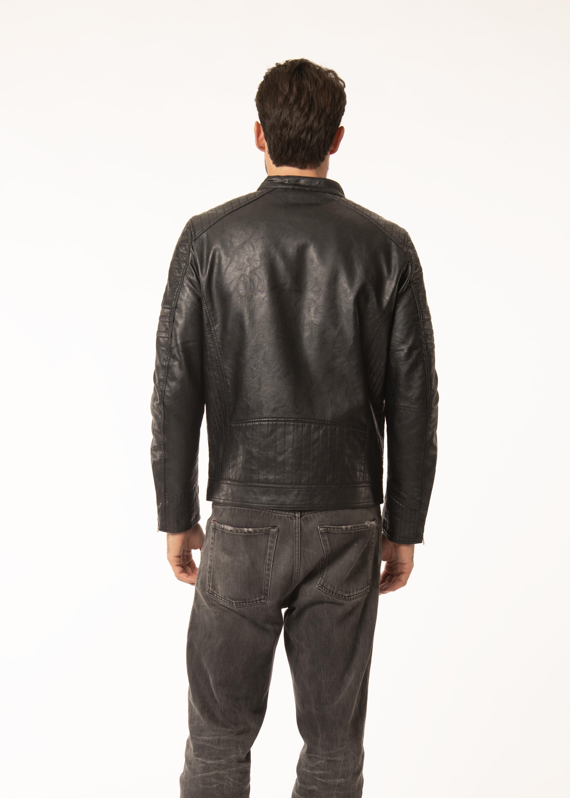 Giubbino in ecopelle stile bikercon colletto alla coreana e cinturinocuciture decorative su tutto il giubbino.