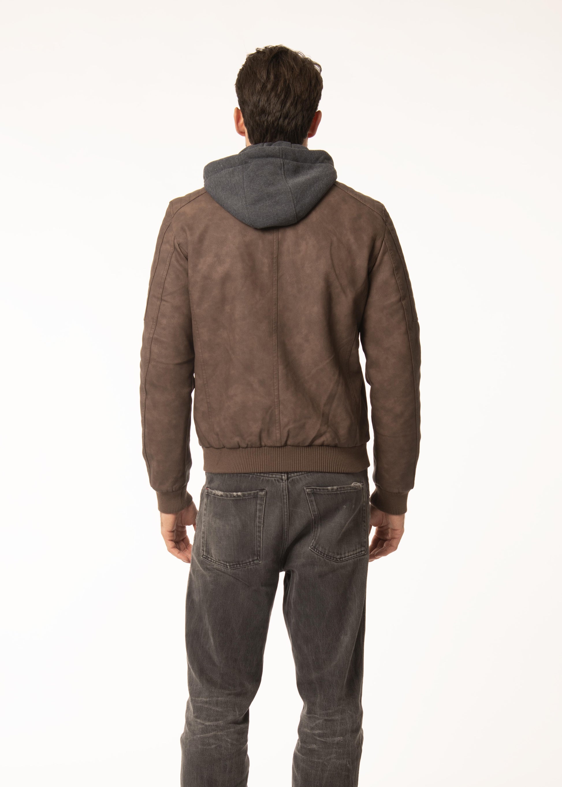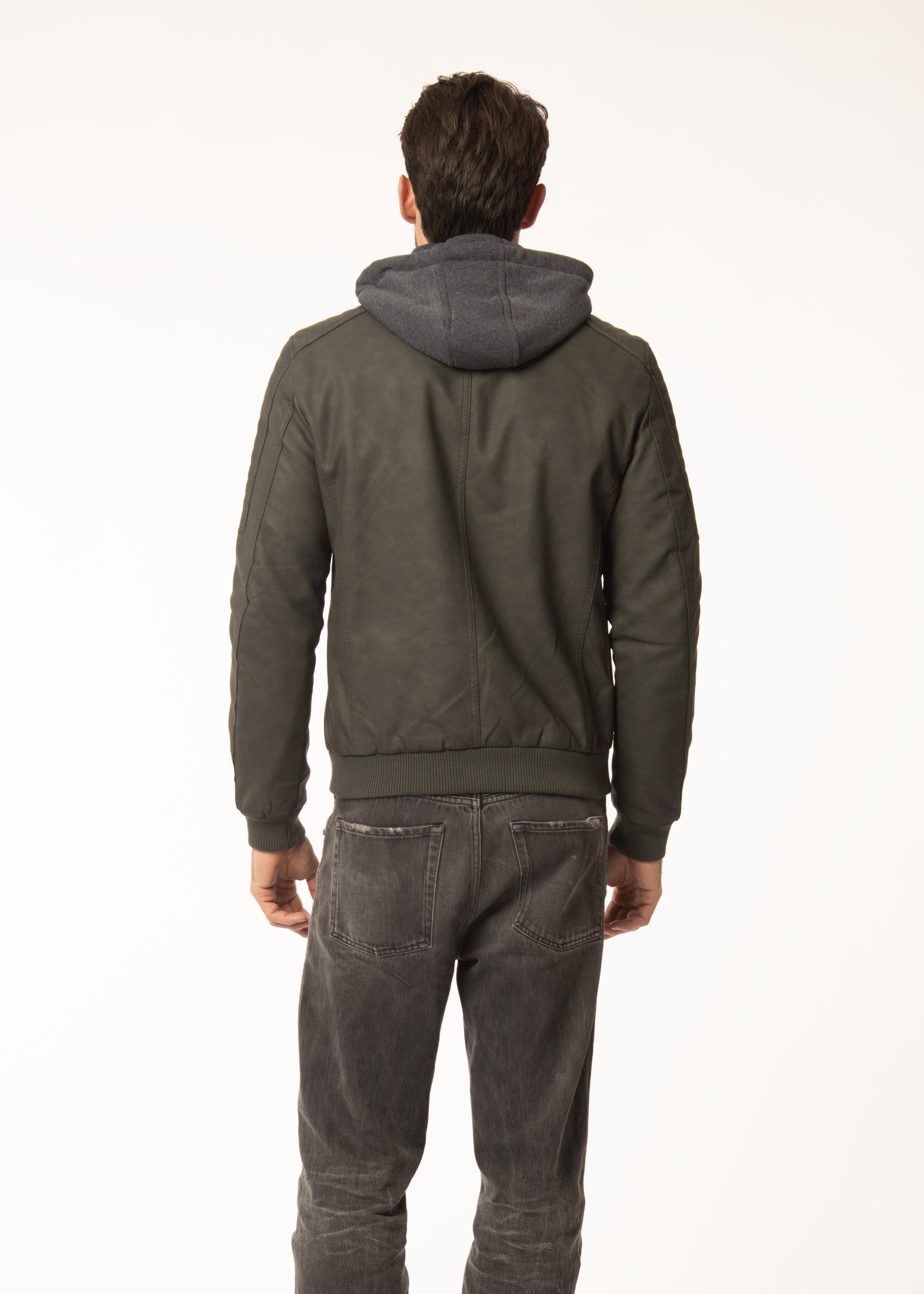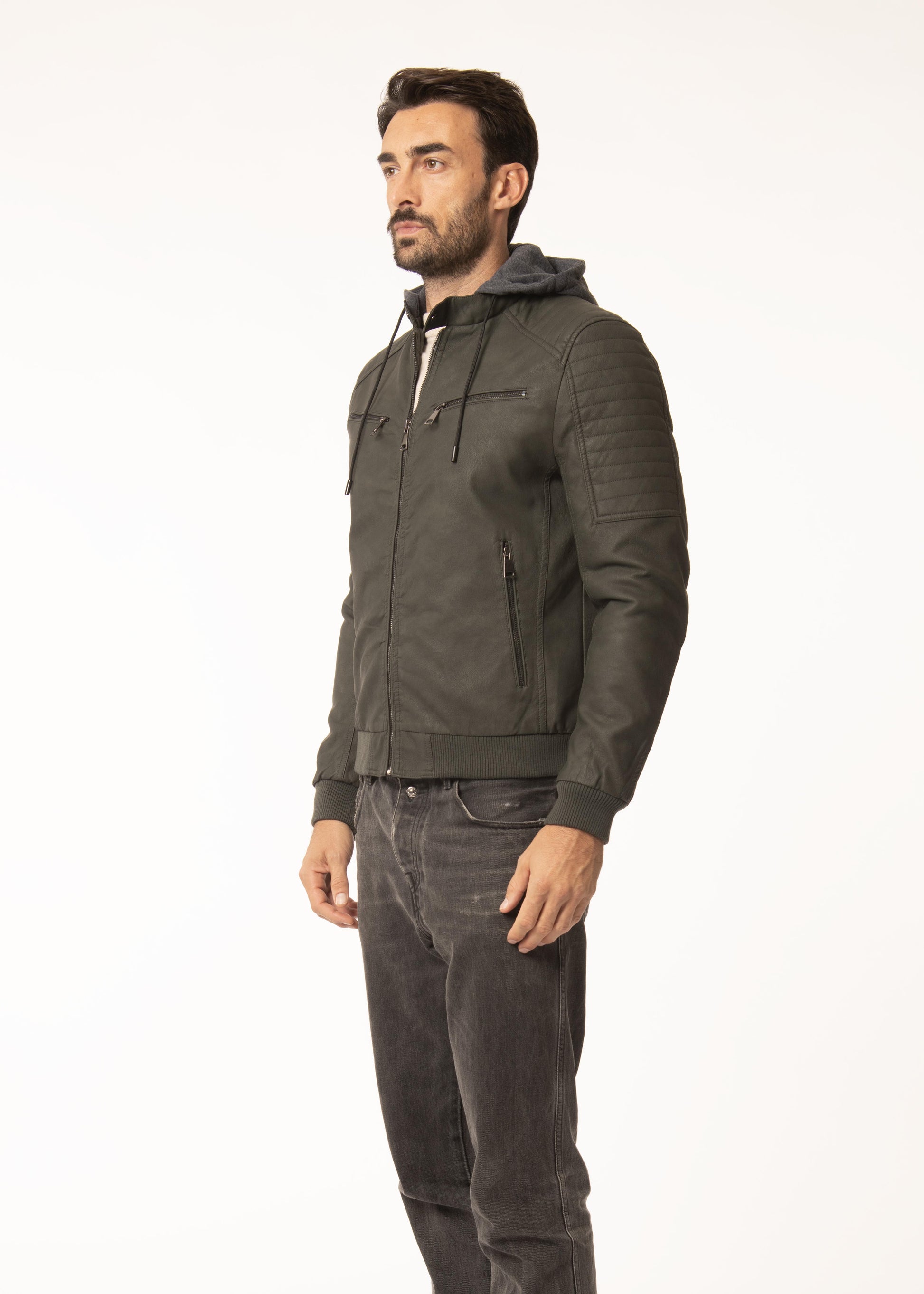 Giubbino in ecopelle con imbottitura in ecopiuma e cappuccio staccabile.