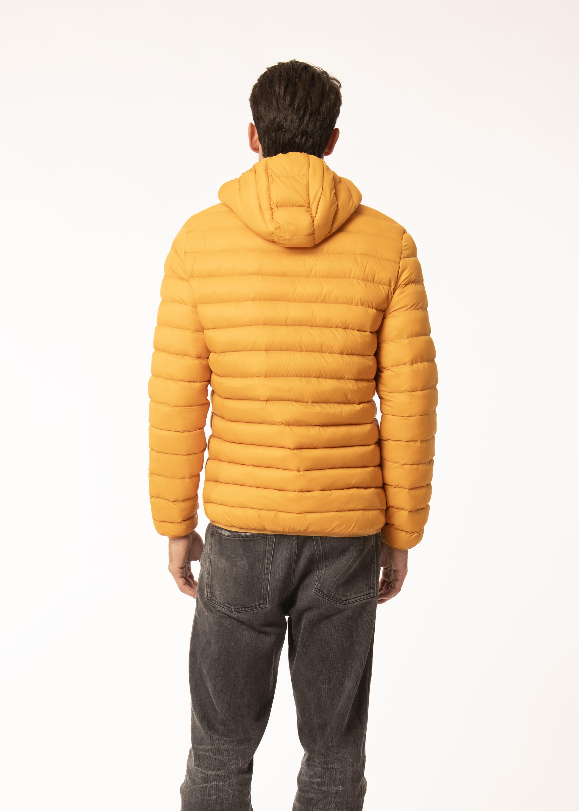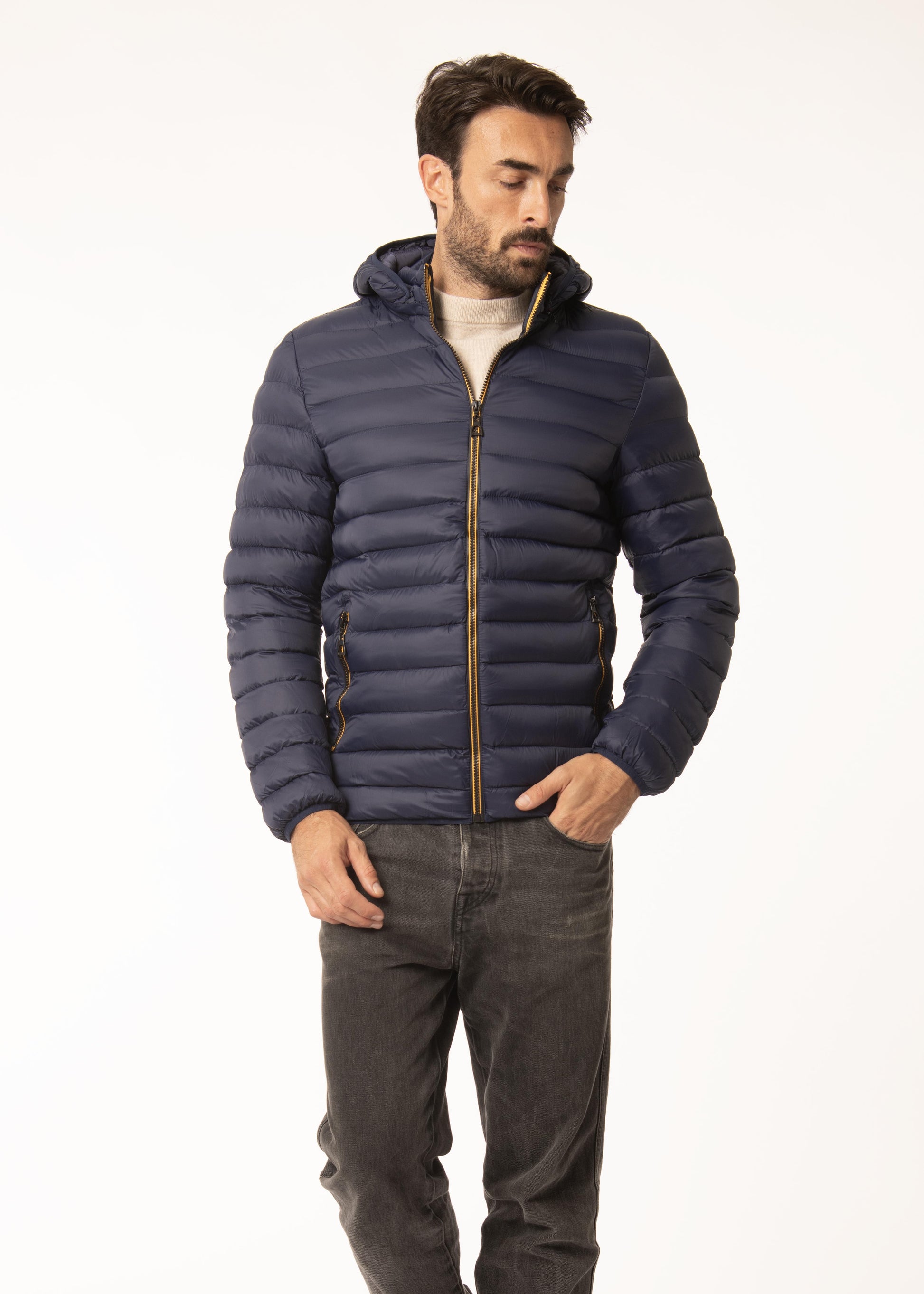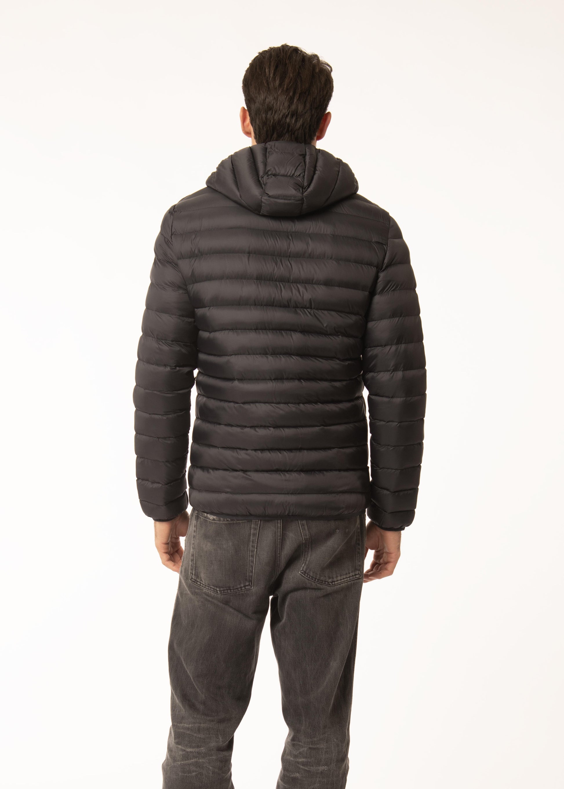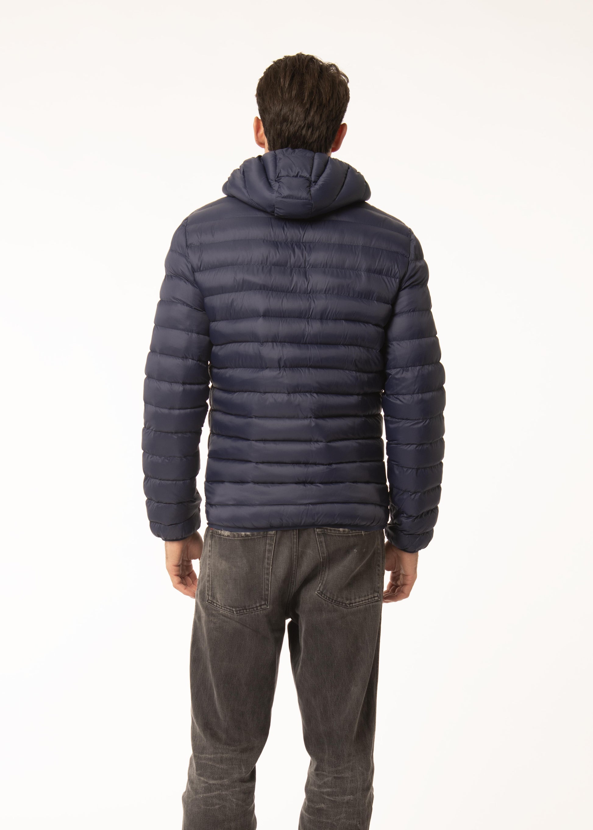 Giubbino in tessuto tecnico con imbottitura in ecopiuma e cappuccio staccabile.