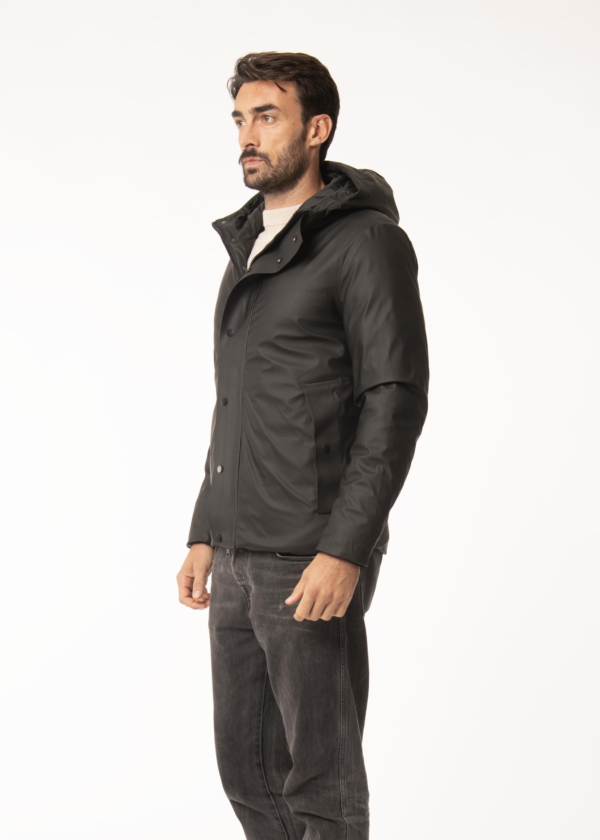 Giaccone imbottito con ovatta termica. Materiale esterno tecnico tipo gommato cappuccio fisso zip centrale con patta copri zip tasche laterali