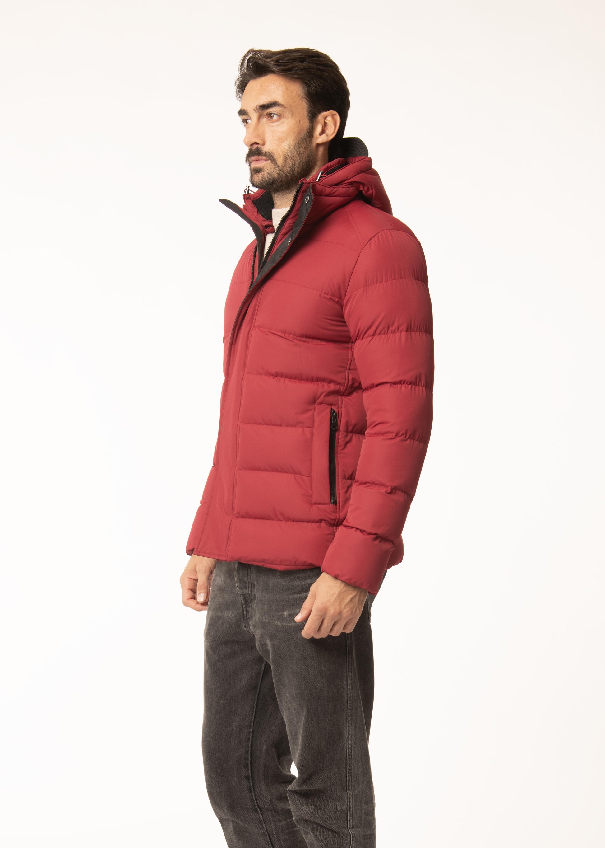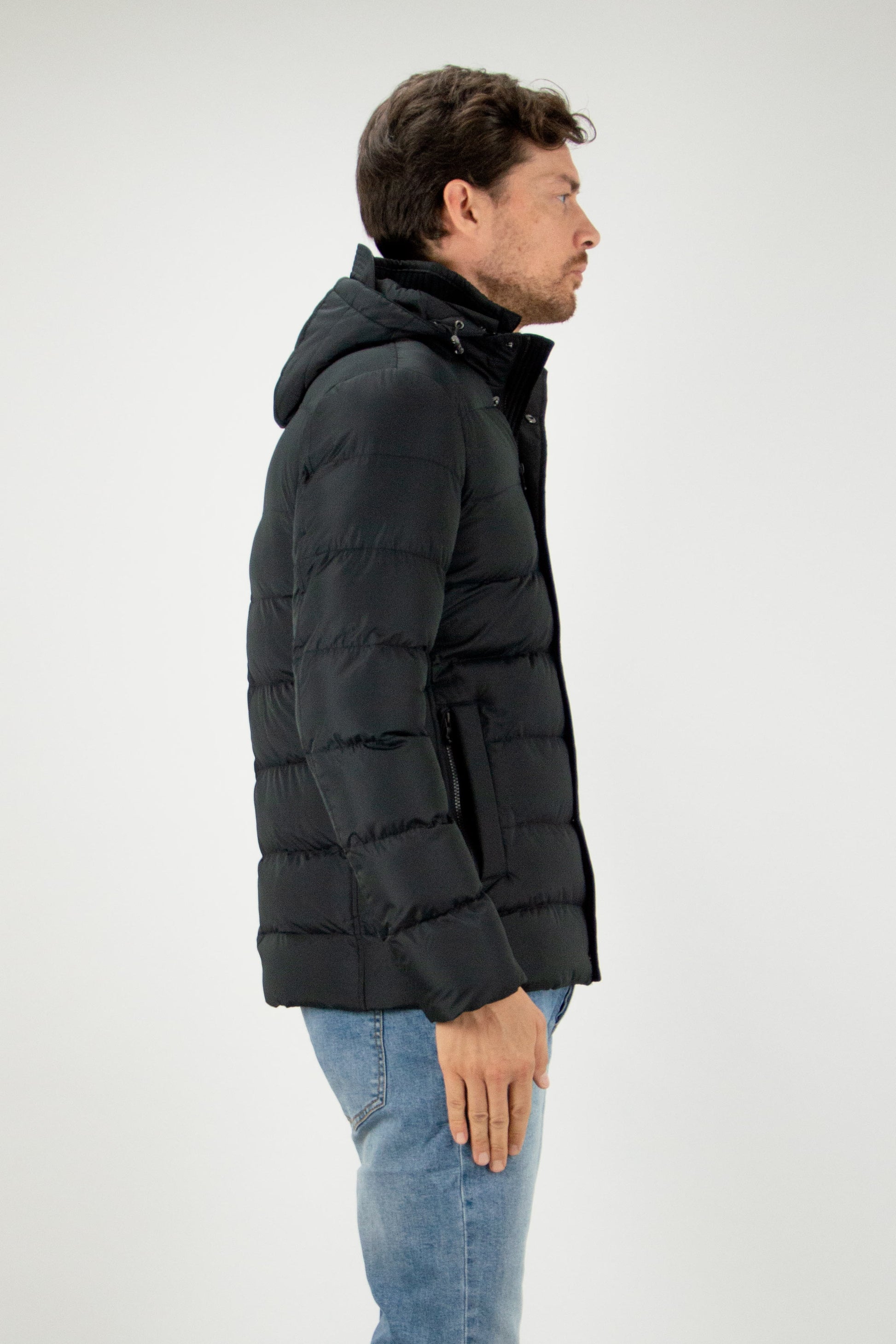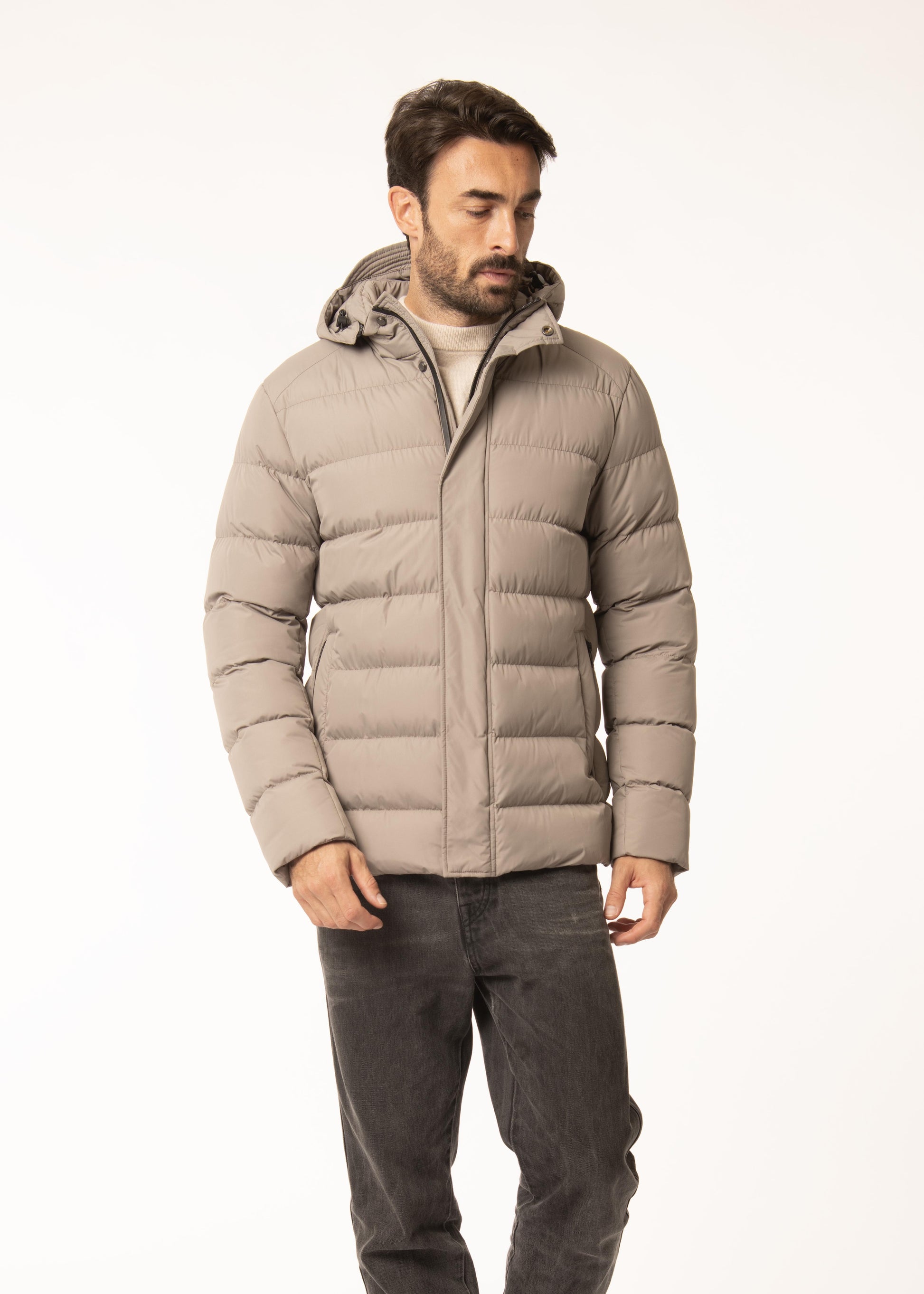 Giaccone in tessuto tecnico con imbottitura in ecopiuma cappuccio ed interno collo staccabile.