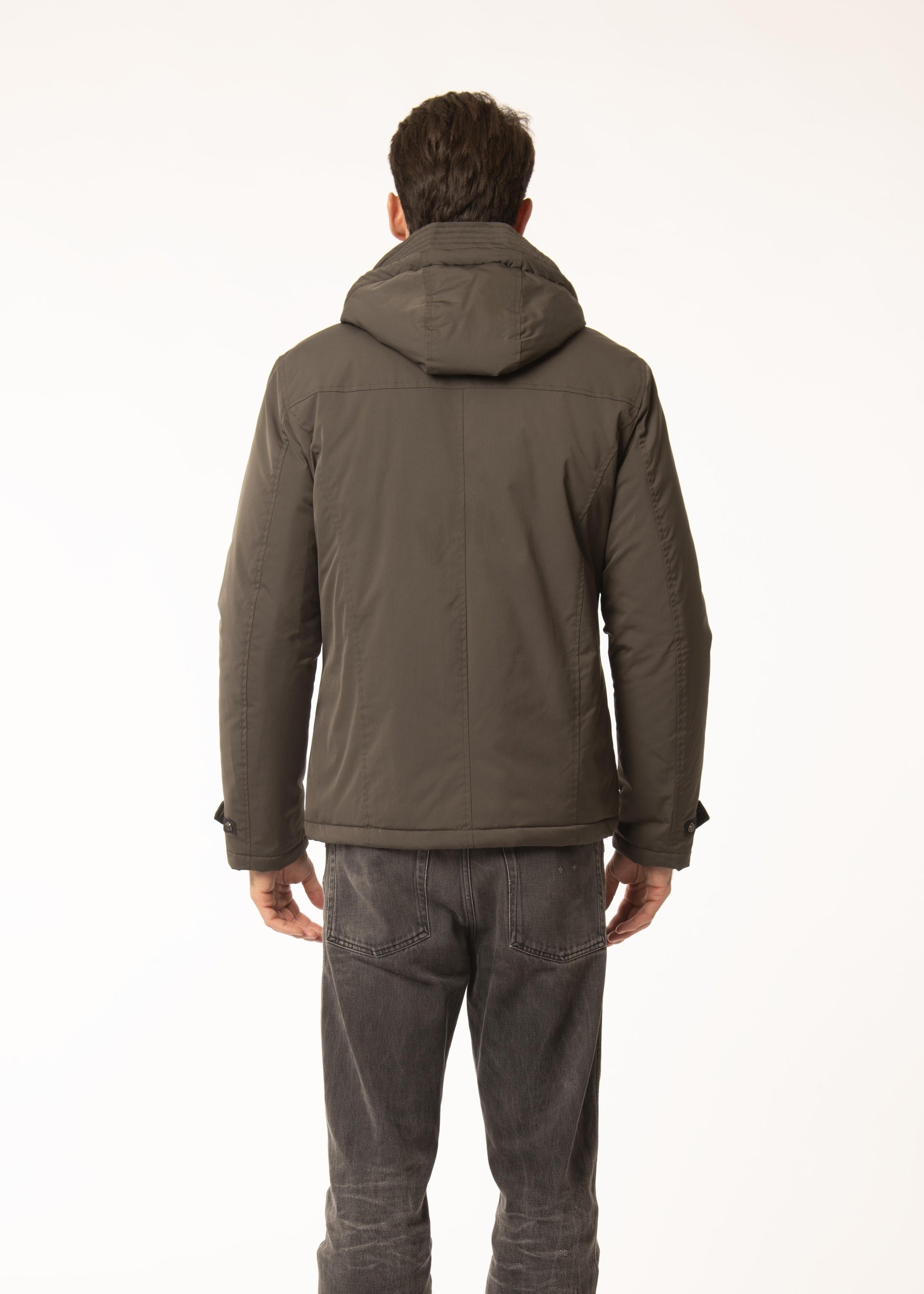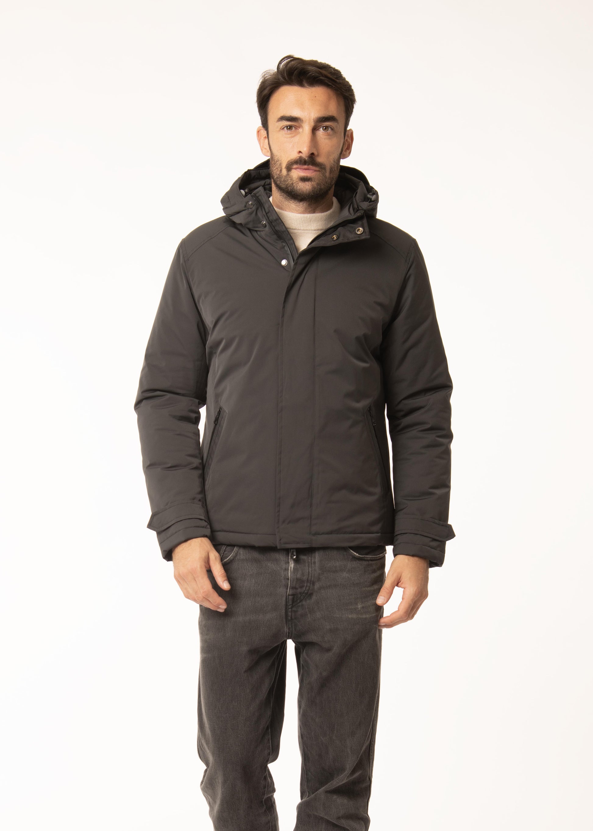 Giubbino in tessuto tecnico con imbottitura in ecopiuma cappuccio staccabile.