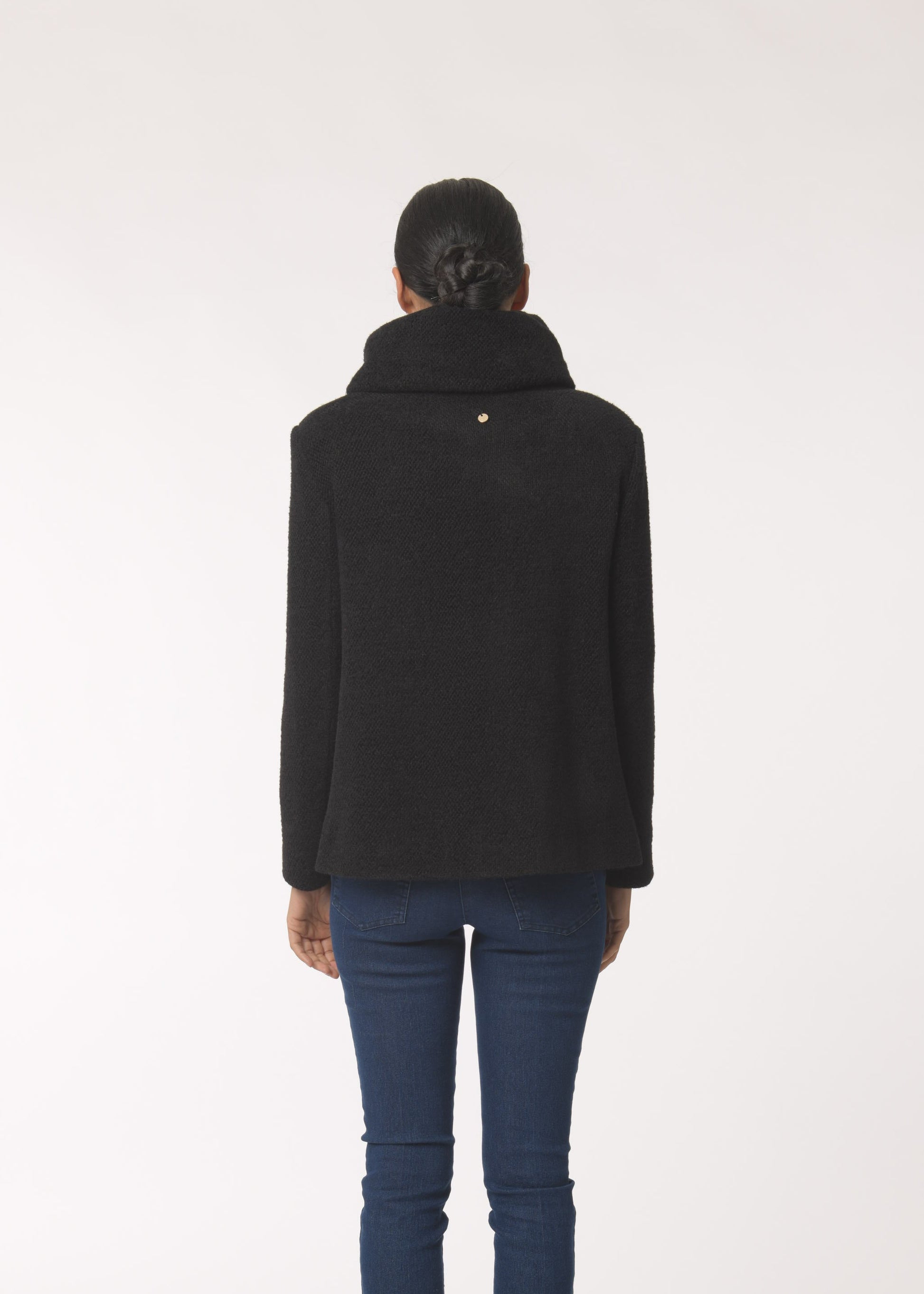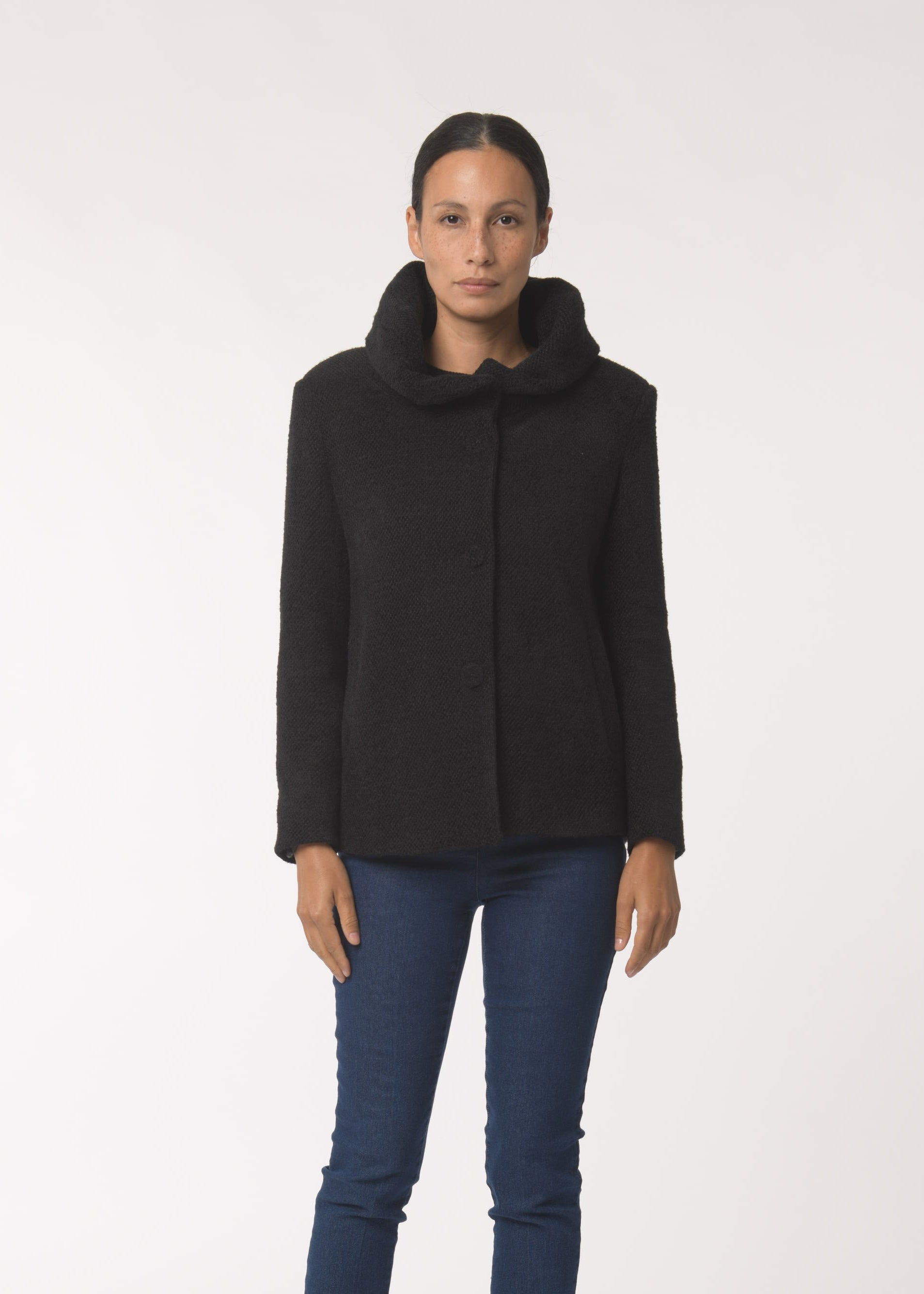 Cappotto in panno con bottoni in tessuto.