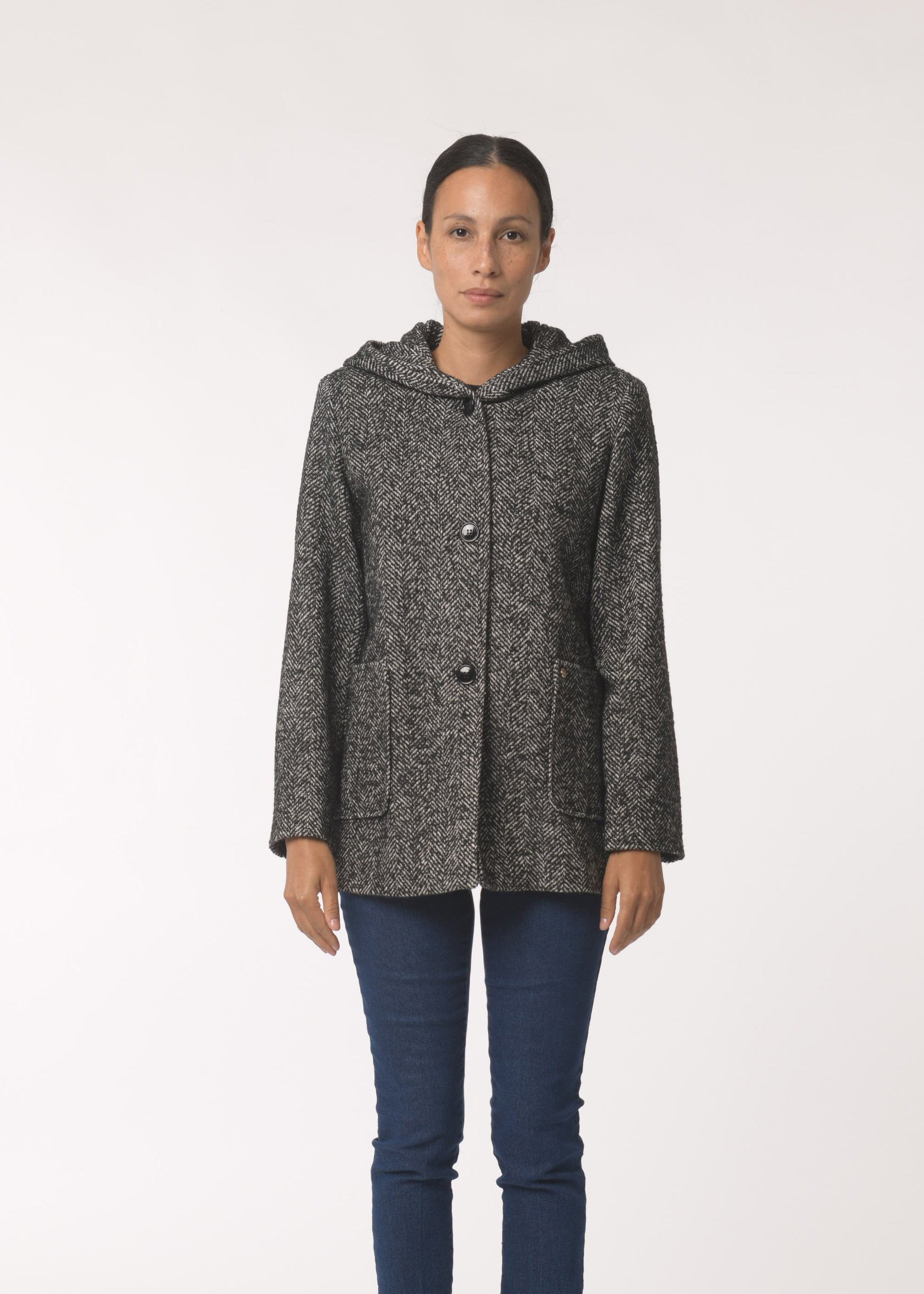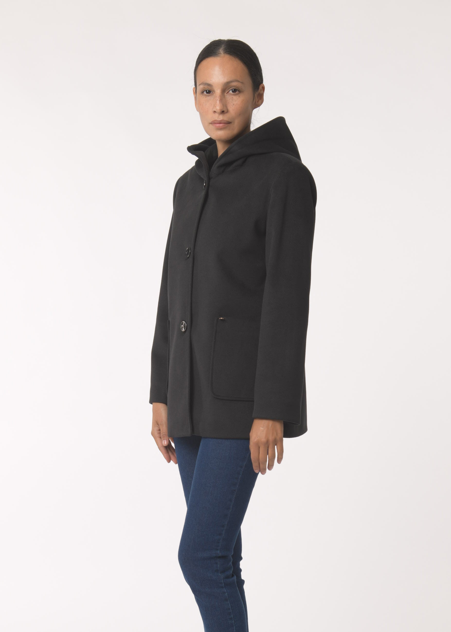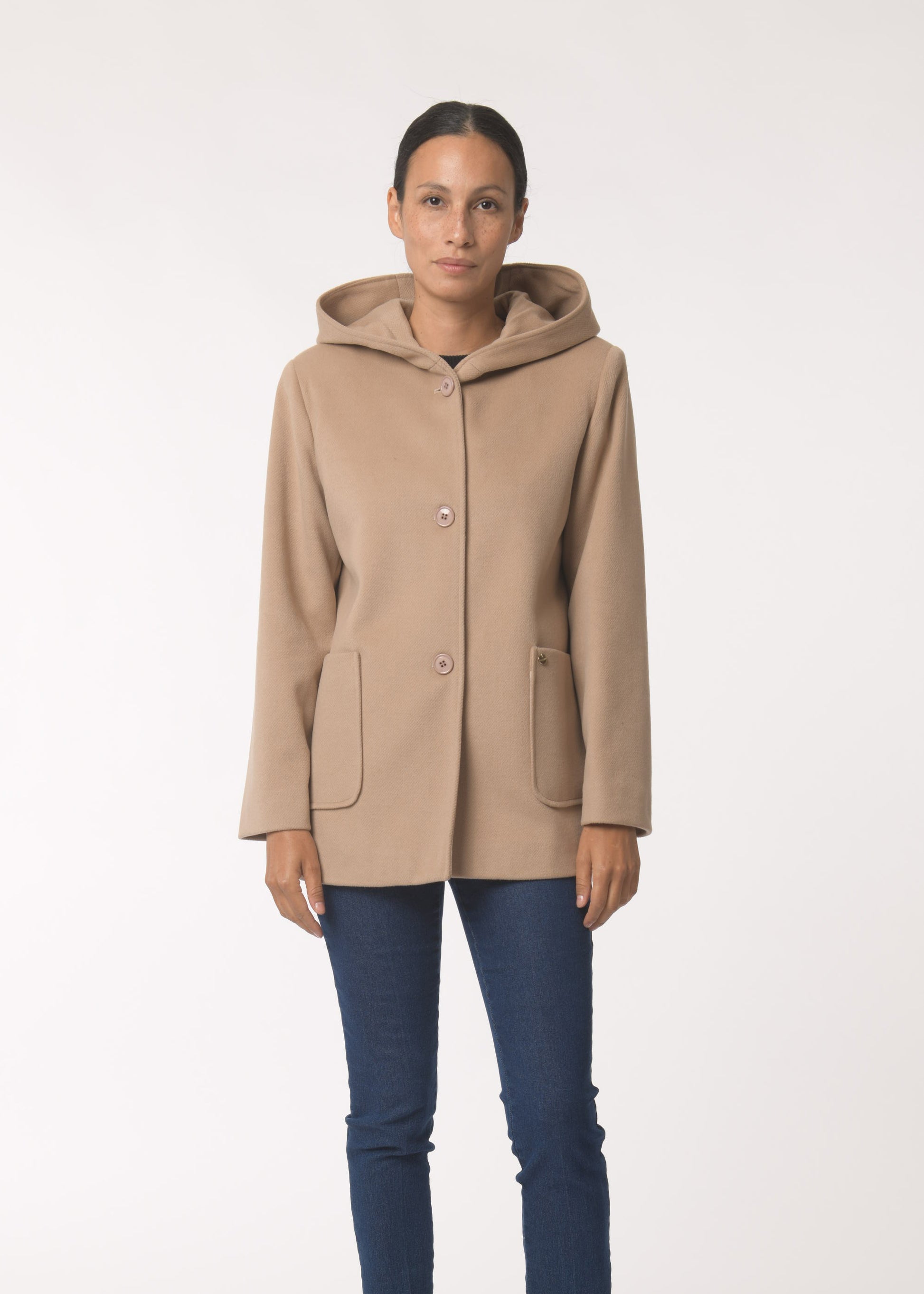 Cappotto in panno con cappuccio e bottoni in pasta.